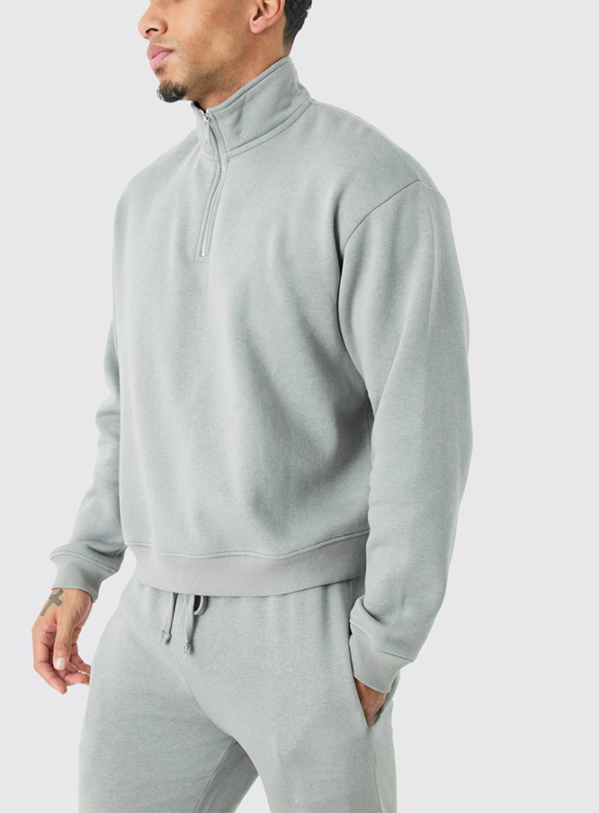 ชุดเซ็ตเสื้อผ้าผู้ชายขายส่ง ผ้าฝ้ายฟลีซ ชุดออกกำลังกาย 2 ชิ้น เสื้อสเวตเตอร์ซิปครึ่งตัว & กางเกงขายาวทรงตรง โลโก้ด้านหน้า ชุดวอร์ม