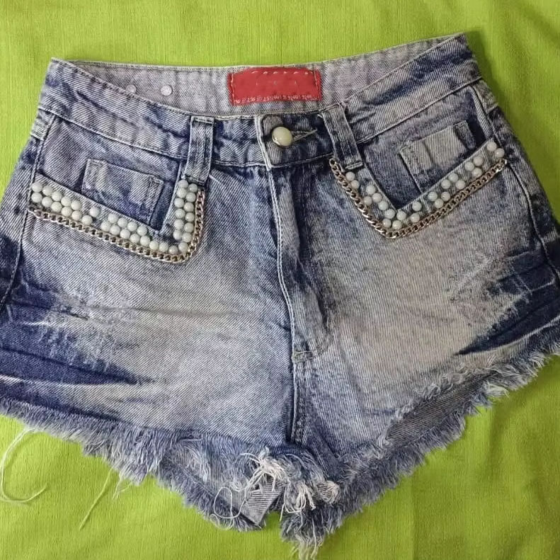 กางเกงยีนส์ขาสั้นแฟชั่นประดับเพชรพลอยสีน้ำเงินสำหรับฤดูร้อน เอวสูง ขาดๆ แบบขายส่งสำหรับผู้หญิง