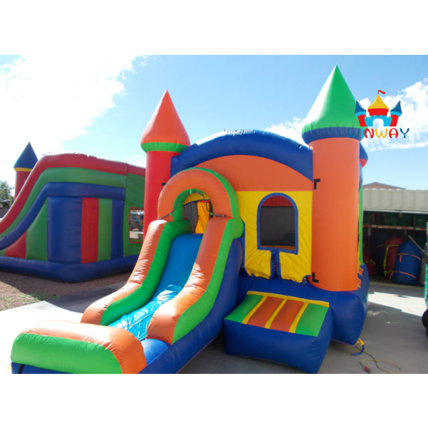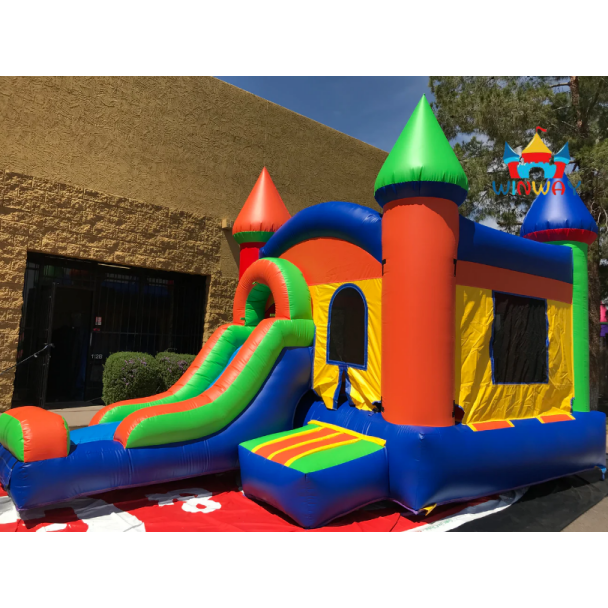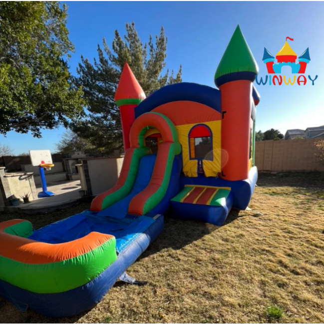 บ้านเด้งเป่าลมสีสันสดใสพร้อมสไลด์สำหรับงานปาร์ตี้กลางแจ้งสวนหลังบ้านเด็ก