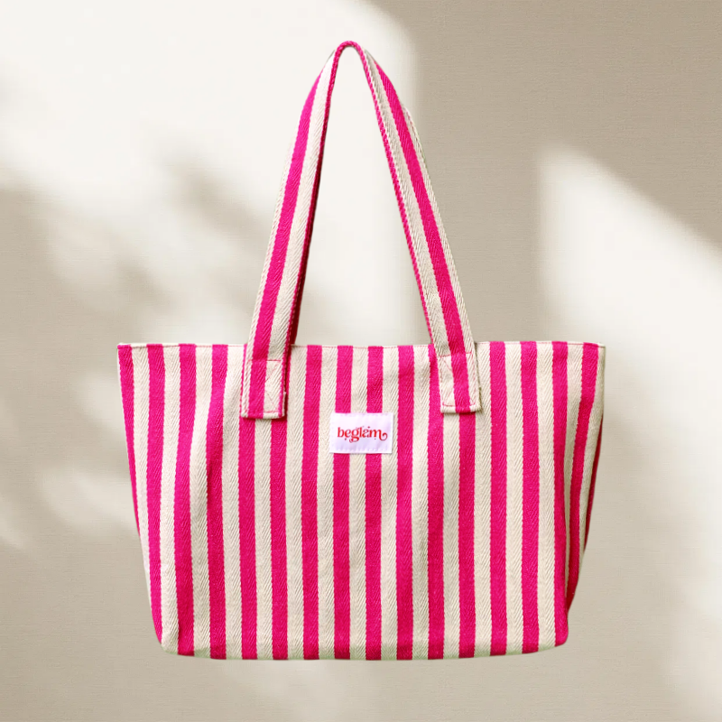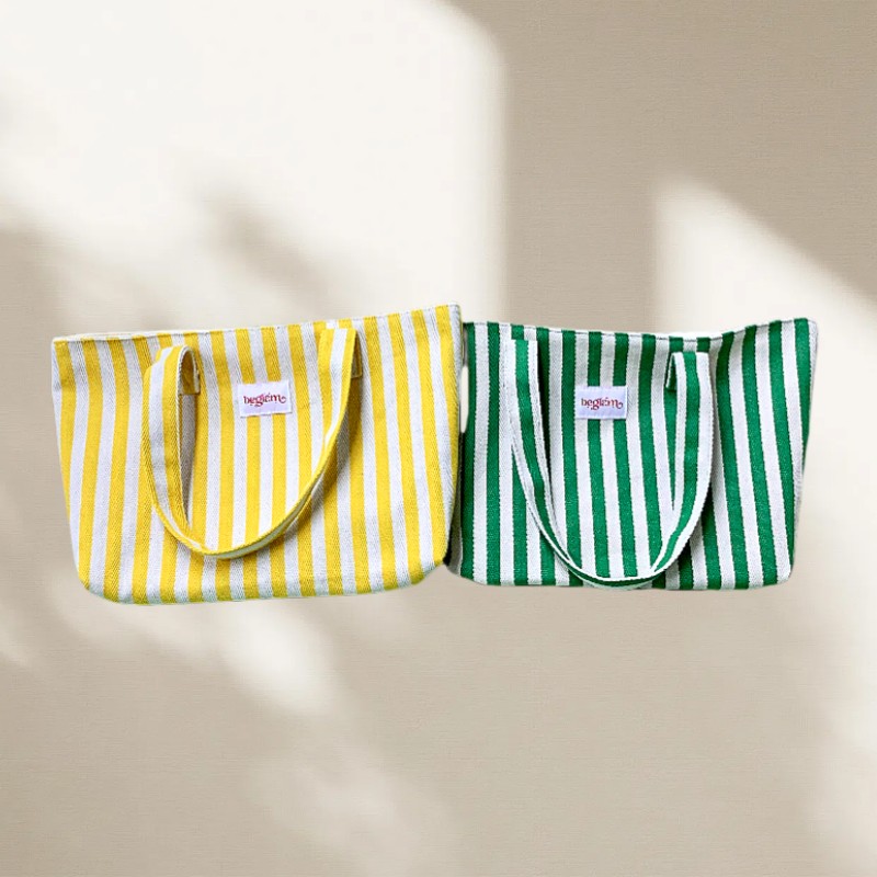 กระเป๋าผ้าคอตตอนลายทางสีสันสดใสกระเป๋าโท้ทช็อปปิ้งความจุขนาดใหญ่กระเป๋าชายหาดแบบพกพาพร้อมป้ายโลโก้