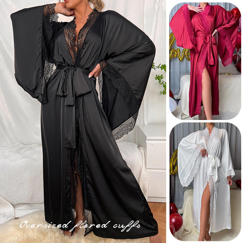 เสื้อคลุมลูกไม้แขนยาวสำหรับผู้หญิงเสื้อคลุมอาบน้ำผ้าซาตินเซ็กซี่ระบายอากาศได้ดีทันสมัยใส่สบาย