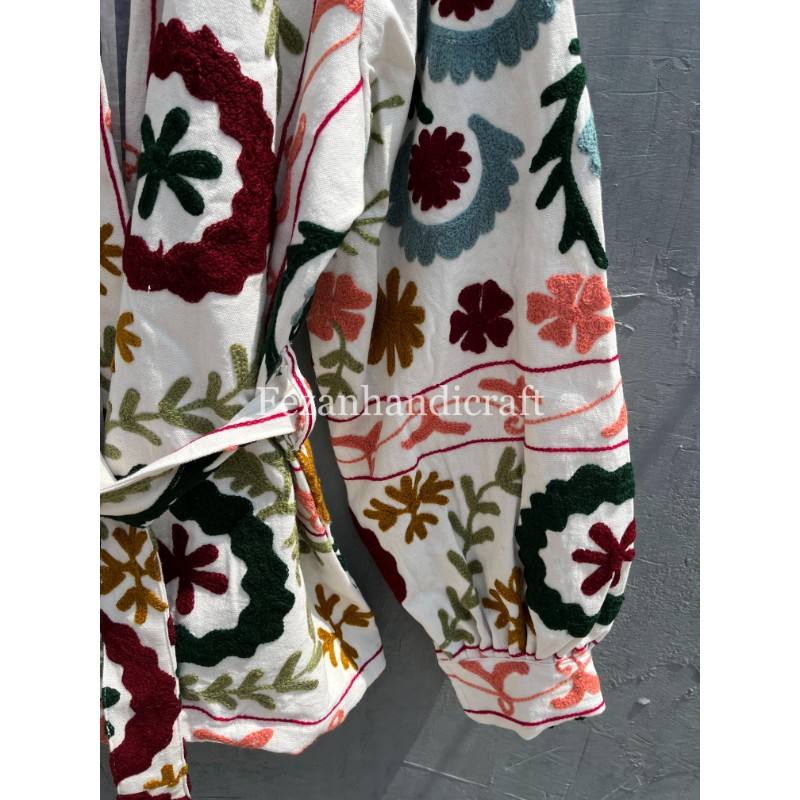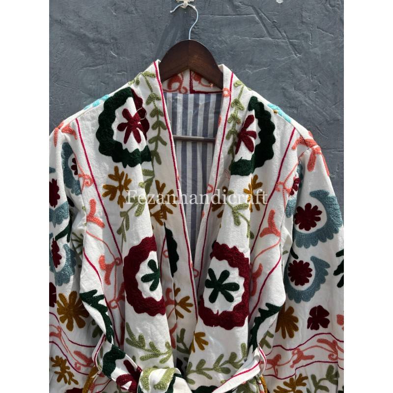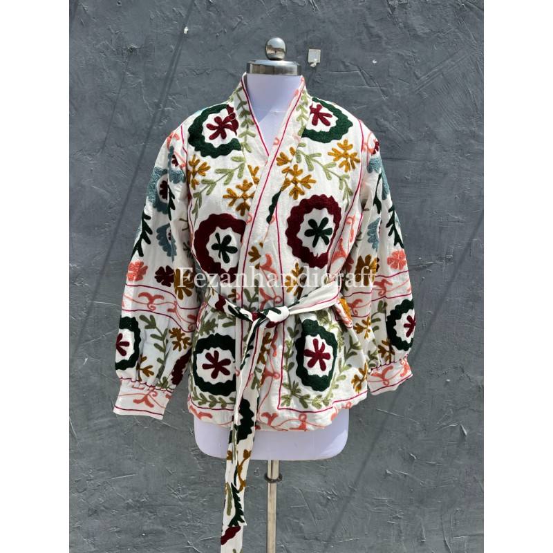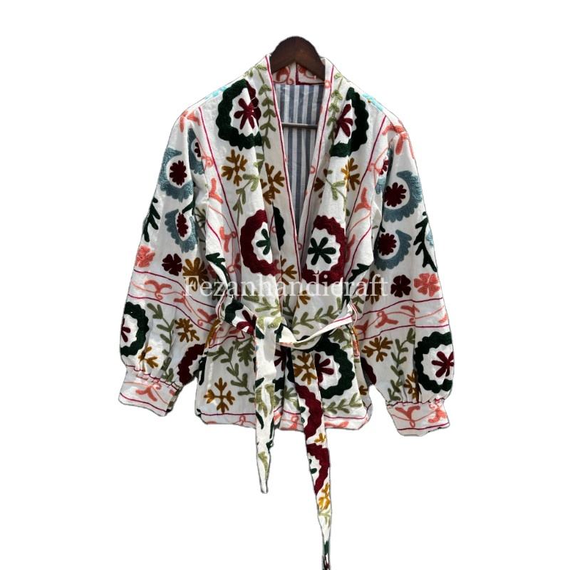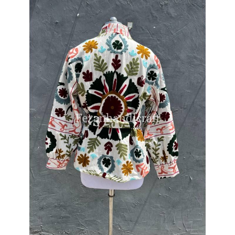 UZbek เสื้อแจ็กเก็ตผ้าคอตตอนซูซานี่ปักด้วยมือสำหรับผู้หญิงคอตั้งสำหรับงานปาร์ตี้เสื้อโค้ทแบบถักเข็มขัดสำหรับฤดูใบไม้ร่วง