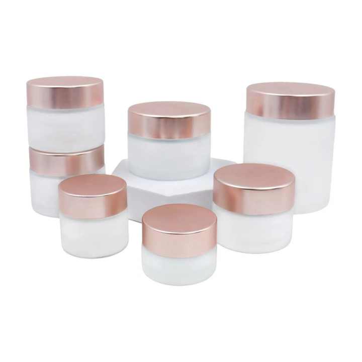 ขวดครีมแก้วใสฝ้าแบบขายส่ง ขนาด 5 มล. 10 มล. 15 มล. 20 มล. 30 มล. 50 มล. 100 มล. พร้อมฝาพลาสติกสีโรสโกลด์