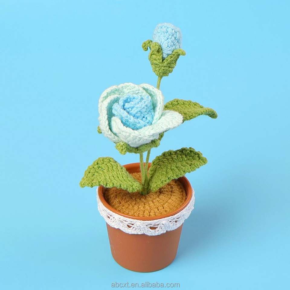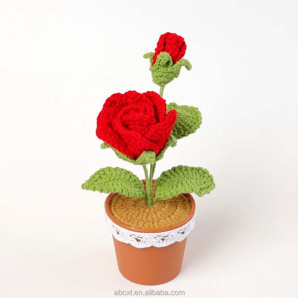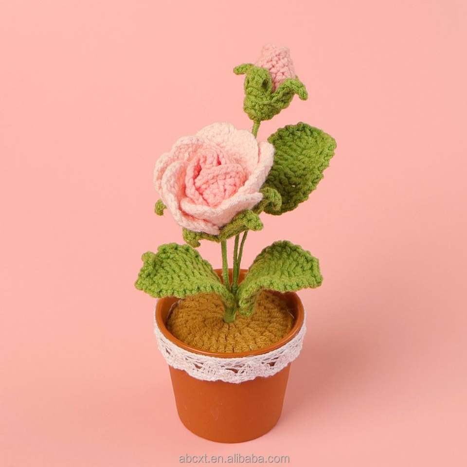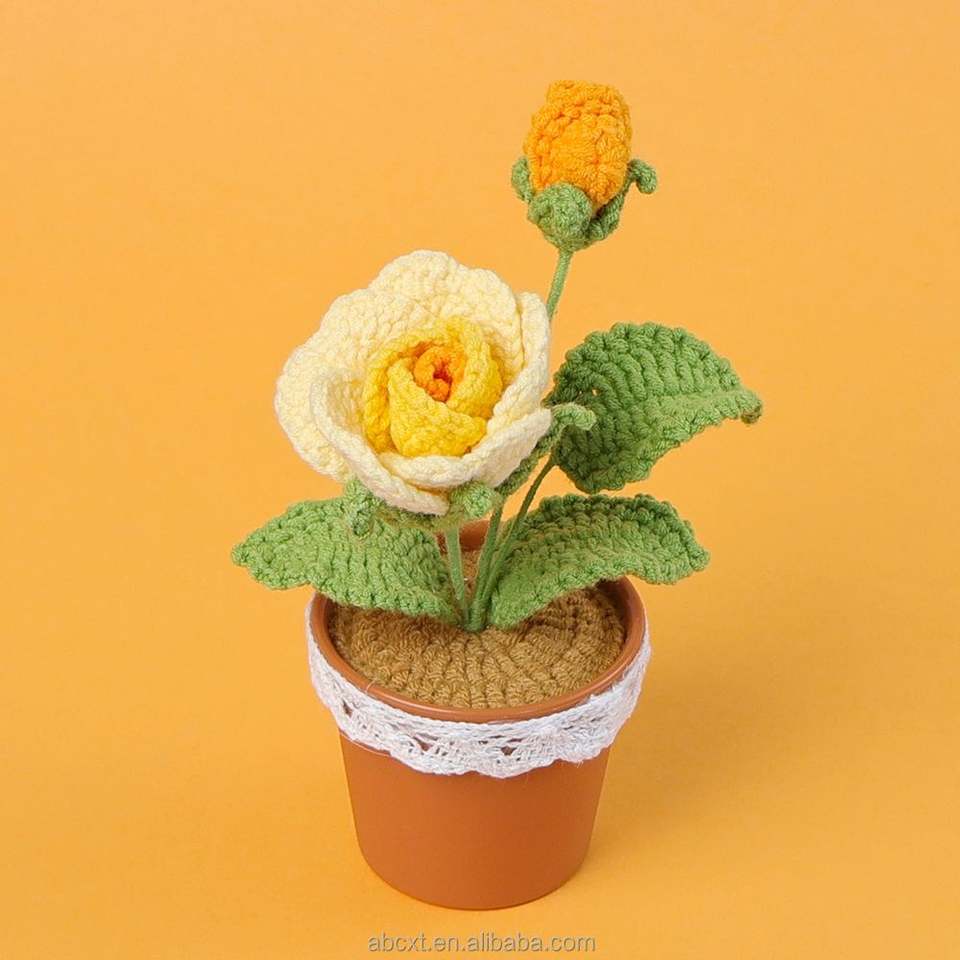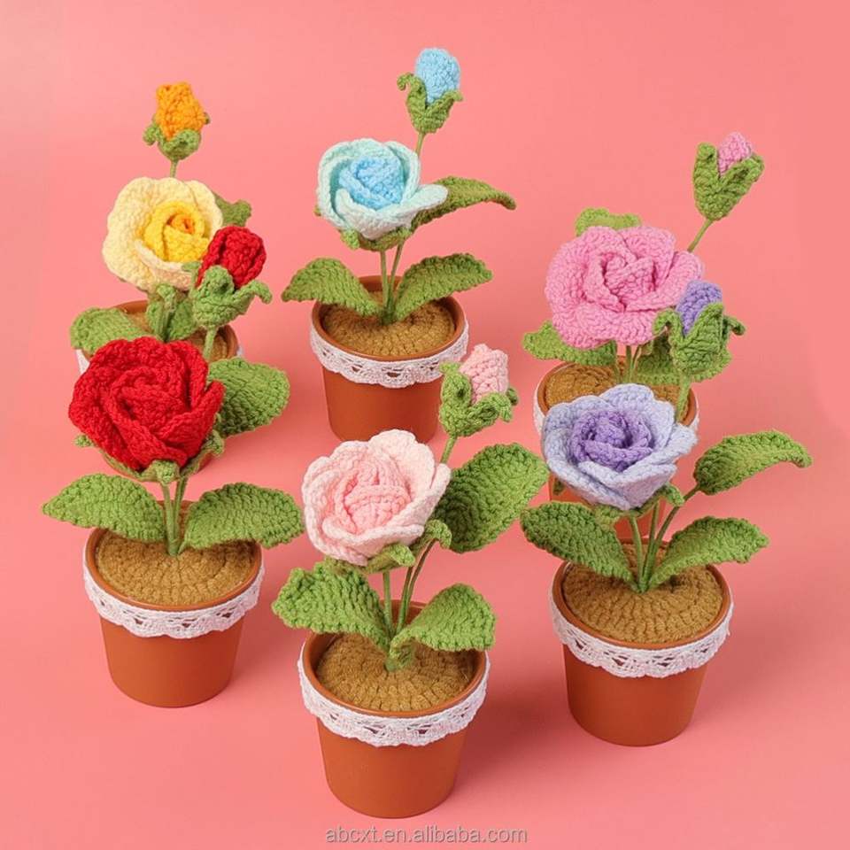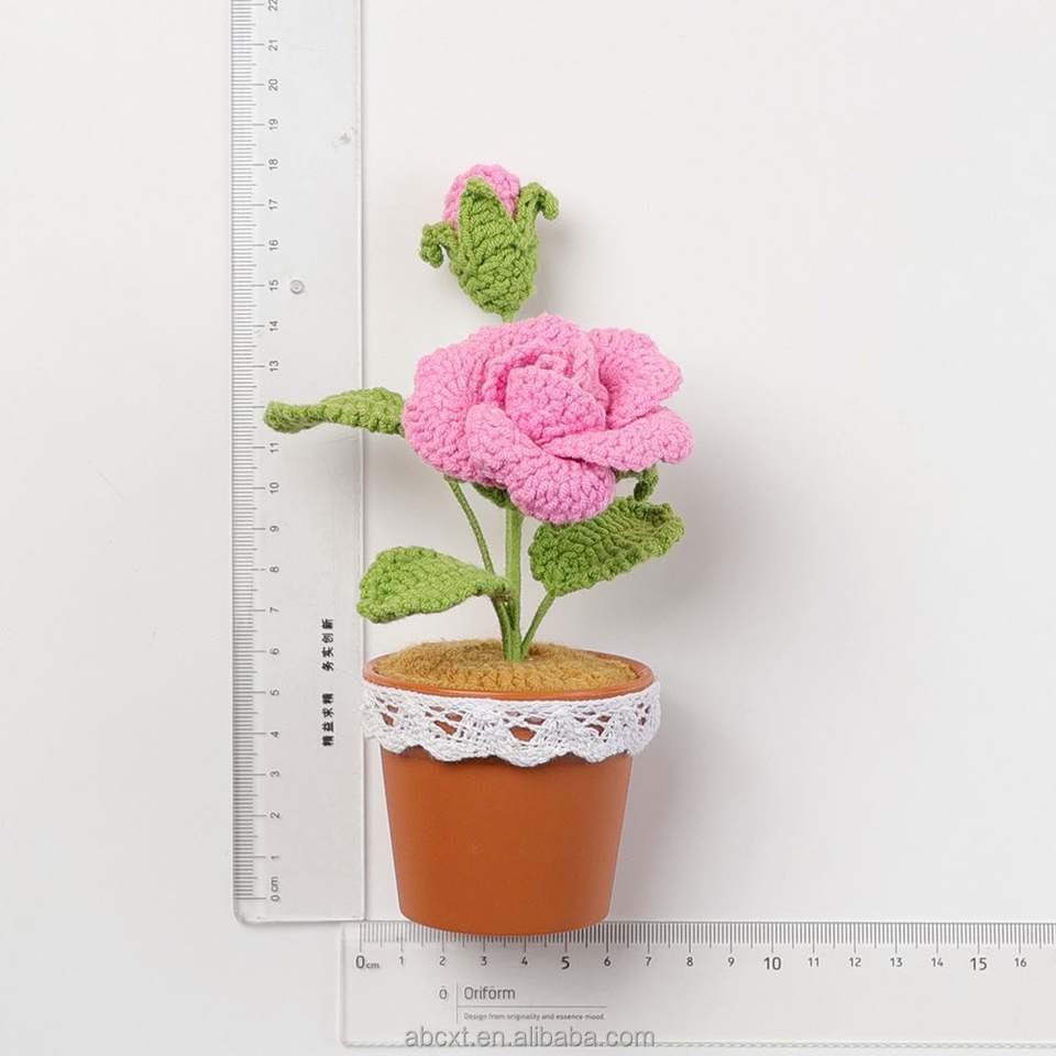 กระถางดอกไม้ไหมพรมถักโครเชต์รูปดอกกุหลาบทำมือขายส่ง สำหรับตกแต่งบ้าน-ของขวัญวันรับปริญญา วันพ่อ และวันฮาโลวีน
