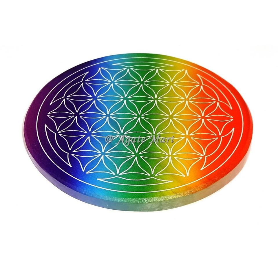 Wholesale Crystal Selenite Stone Engraved Selenite Rainbow Flower of Life Engraved Coaster for Meditation and Spiritual