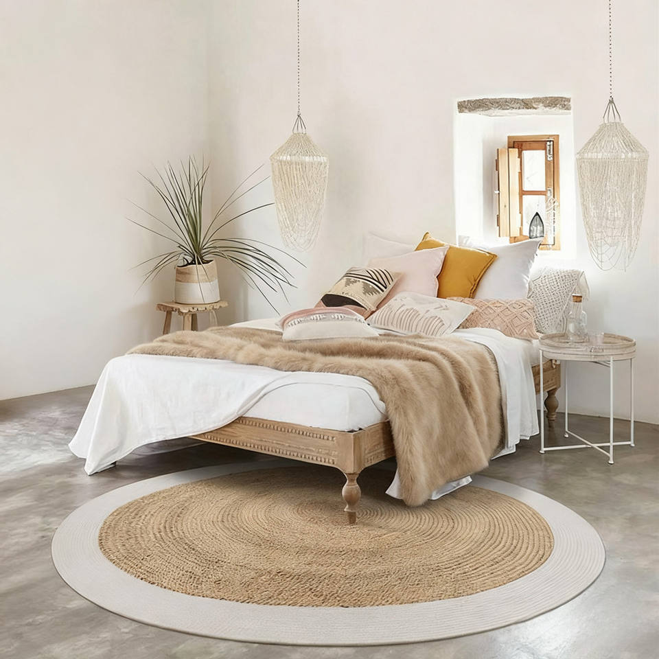 พรมปูพื้นทรงกลมสีขาวคลาสสิก ขอบถักจากหญ้าทะเล ผลิตในจีน เป็นมิตรกับสิ่งแวดล้อม เหมาะสำหรับใช้ในบ้านและโรงแรม ขายส่ง