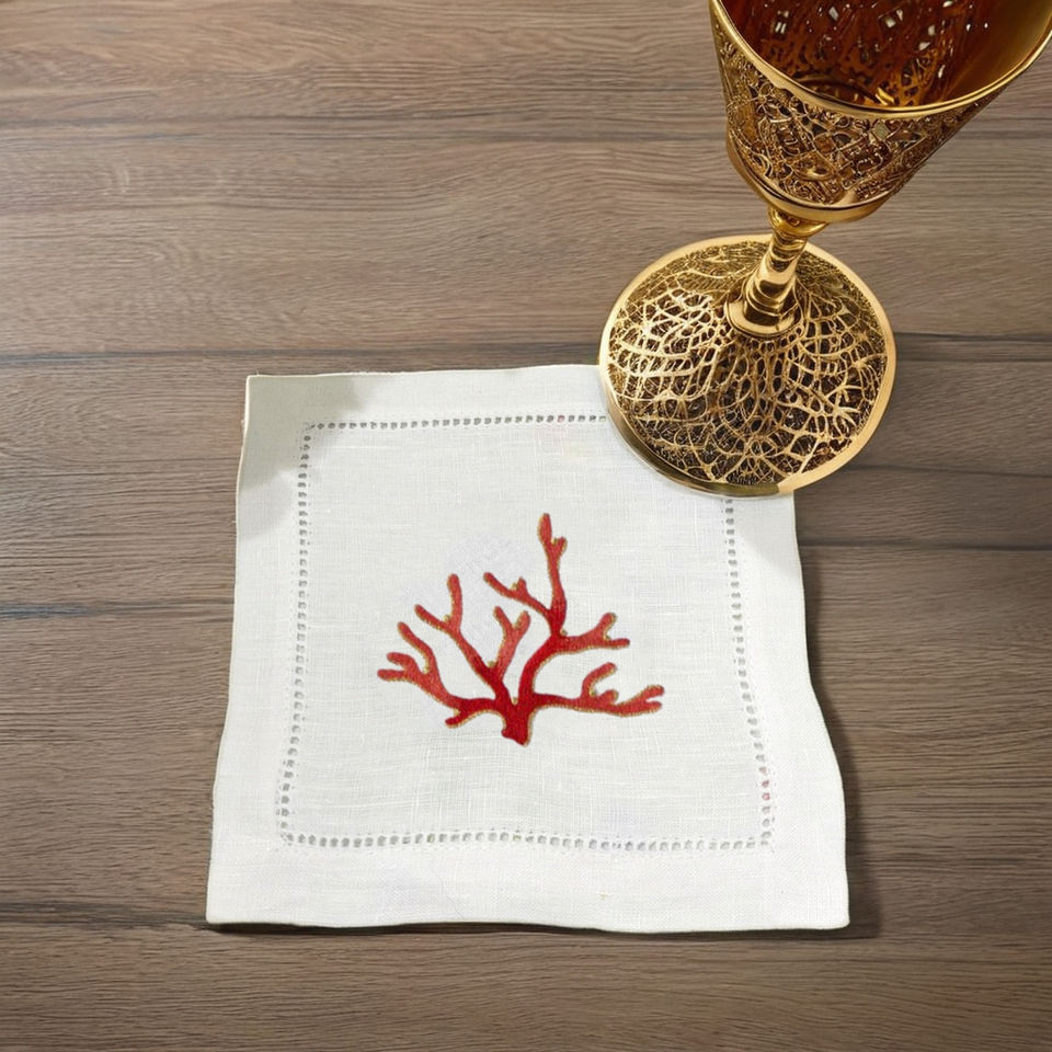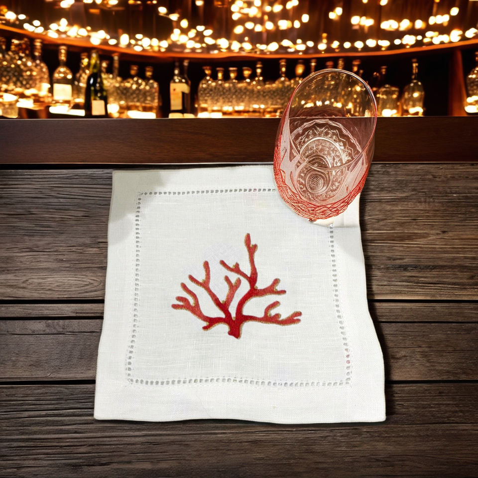ผ้าเช็ดปากค๊อกเทลผ้าลินิน100% สีแดงปักลายปะการัง6x6ผ้าเช็ดปากเครื่องดื่มเย็บริมตกแต่งงานแต่งงานที่บ้านโรงแรมบาร์