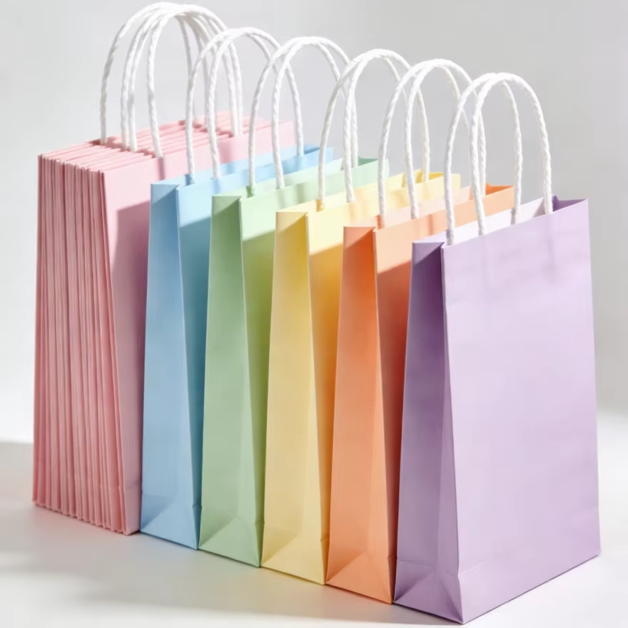 ถุงของขวัญกระดาษคราฟท์สีรุ้งแบบขายส่งสั่งทำพิเศษพร้อมหูหิ้ว พิมพ์โลโก้สำหรับโปรโมชั่นการขาย