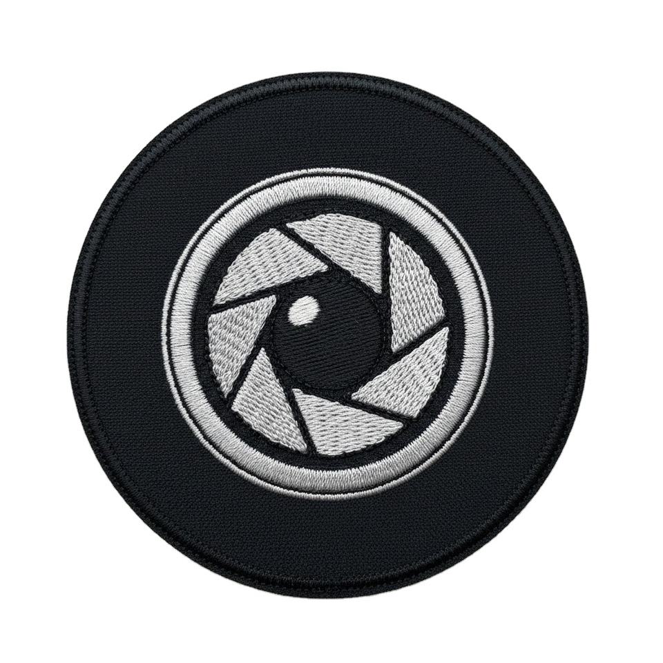แพทช์ปักลายชัตเตอร์เลนส์กล้องแบบกำหนดเองขายส่ง รูปทรงกลม รีดติดเสื้อแจ็คเก็ต ป้ายติดเสื้อผ้าแบบเย็บติดจำนวนมาก อุปกรณ์ตกแต่งเสื้อผ้า