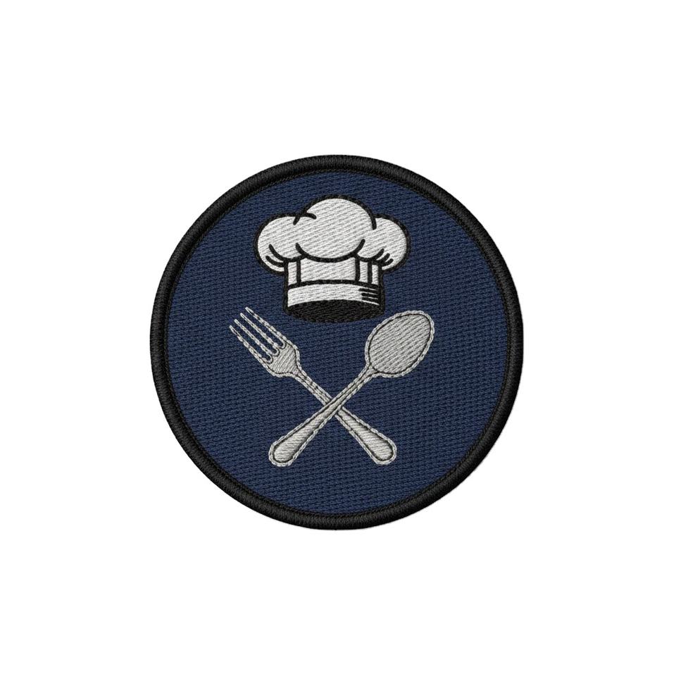 แพทช์ปักลายรูปช้อนส้อมหมวกเชฟแบบขายส่ง ป้ายรีดติดเสื้อผ้าทรงกลมสำหรับชุดยูนิฟอร์มร้านอาหาร แพทช์ติดเสื้อผ้าจำนวนมาก