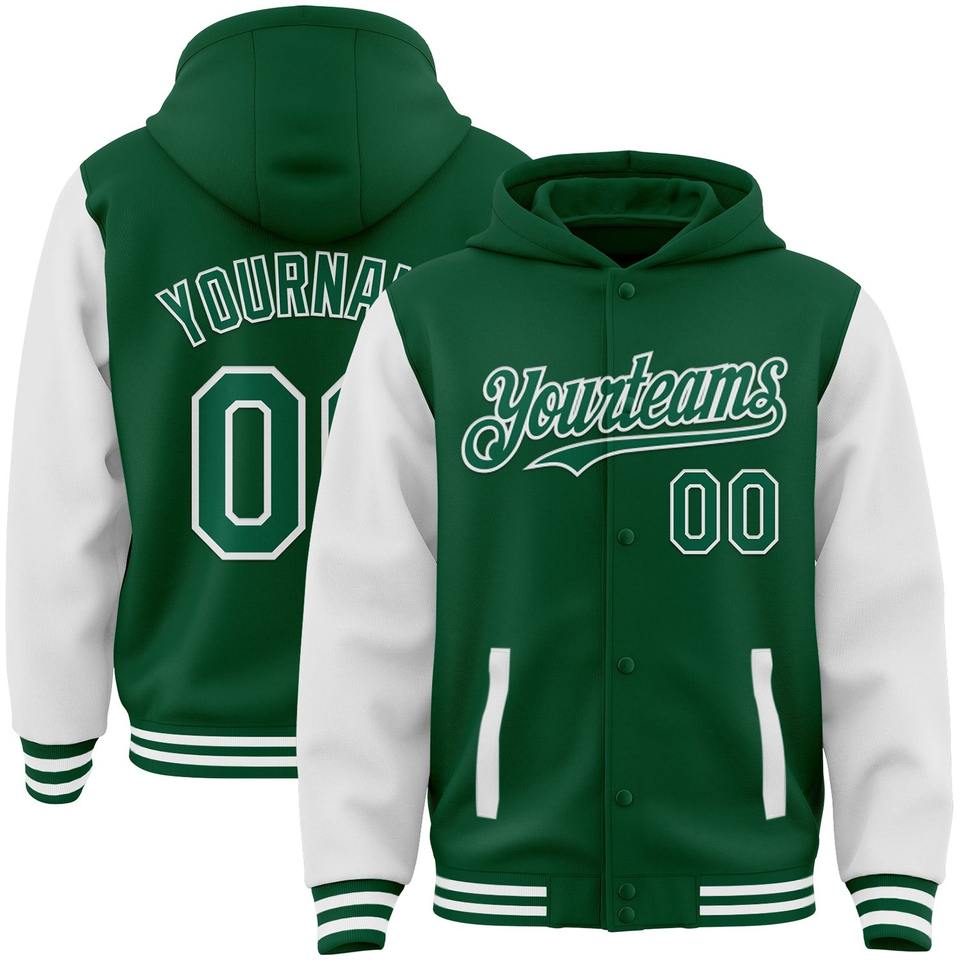 เสื้อแจ็คเก็ตฮู้ดดี้แบบวาร์ซิตี้สองสี รุ่นบอมเบอร์ สีเขียวเคลือบเงาแบบคัสตอม สีขาว ติดกระดุมแบบเต็มตัว สั่งทำขายส่งได้