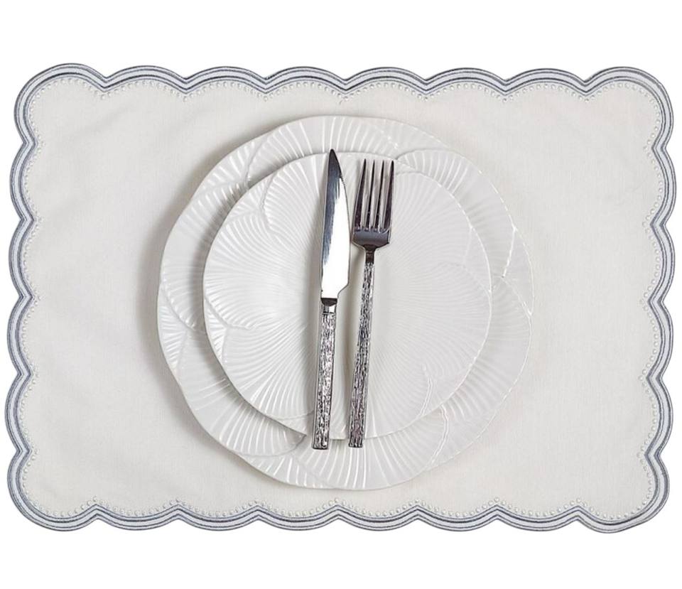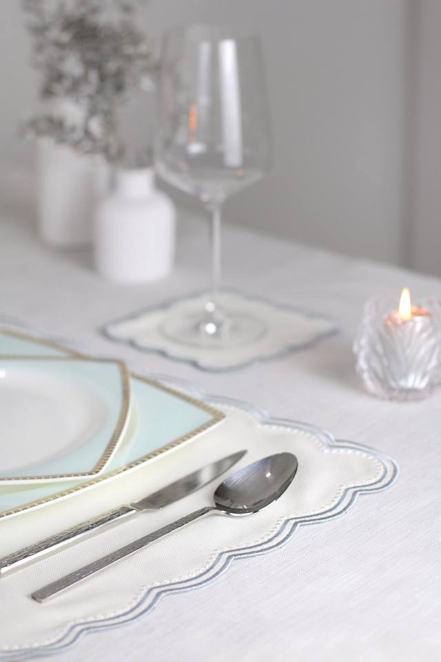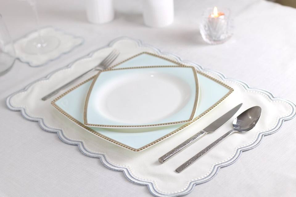 ชุดเสื่อเส้นขอบผ้าฝ้ายลายหอยเชลล์คู่ชุดผ้าปูรองจานด้ายสีฟ้าปักลายสำหรับบ้านโรงแรมวันหยุดงานตามสั่ง