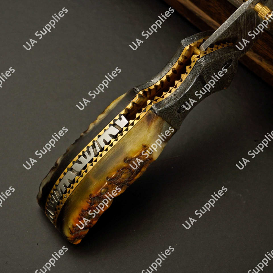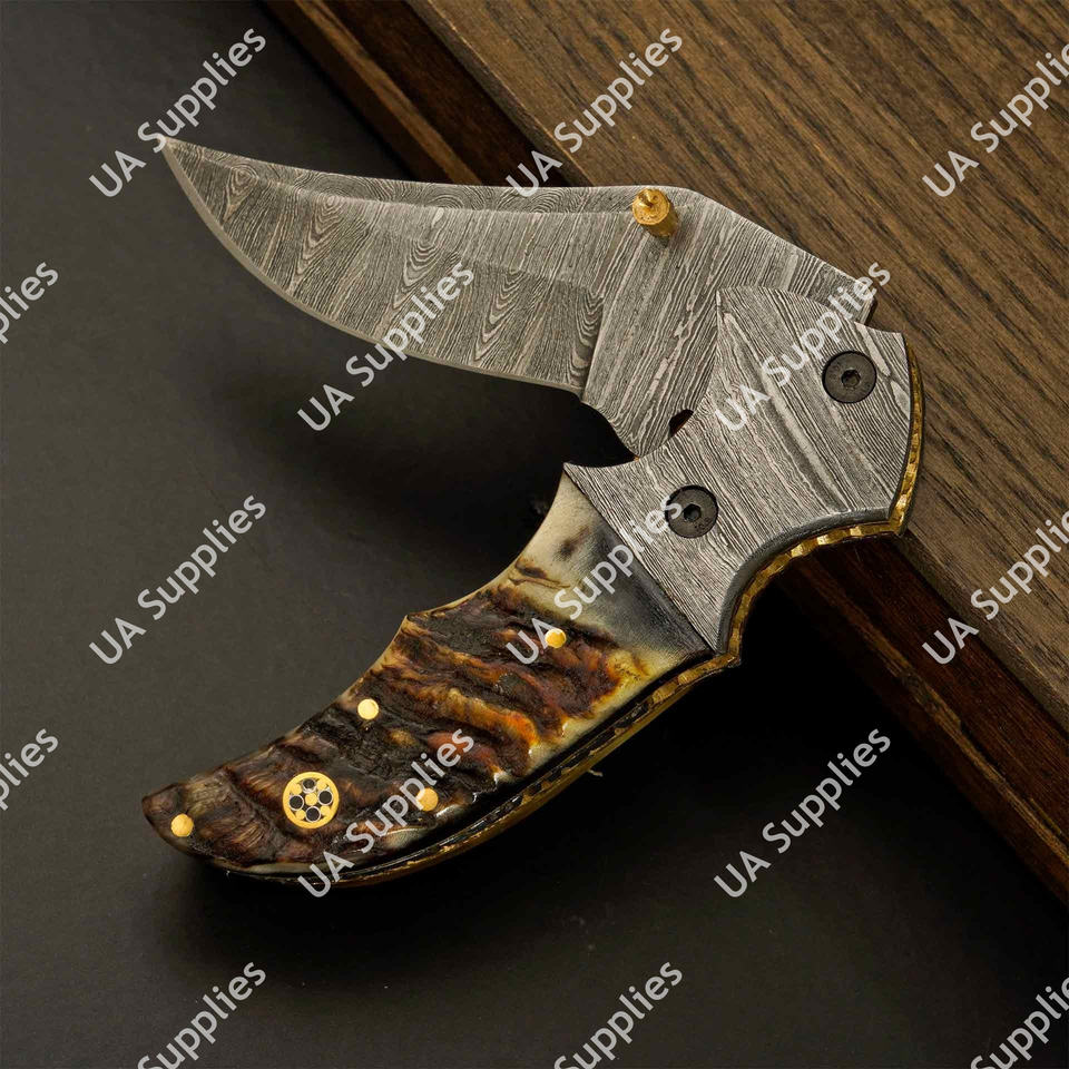 มีดพับดามัสกัสแบบมืออาชีพสั่งทำขายส่ง ด้ามทำจากเขาแกะ เหล็กดามัสกัสตีขึ้นรูปด้วยมือ ตกแต่งด้วยทองเหลือง เหมาะสำหรับกิจกรรมกลางแจ้ง