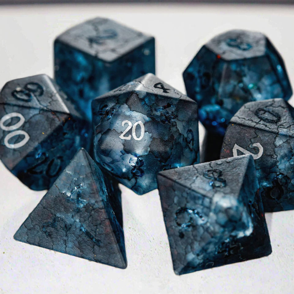 ชุดลูกเต๋าคริสตัลหลายด้าน DND ลูกเต๋าแก้วแตกสีน้ำเงินพร้อมรอยแยกสร้อยคอฝ้าอุปกรณ์เสริมสำหรับเกม DND