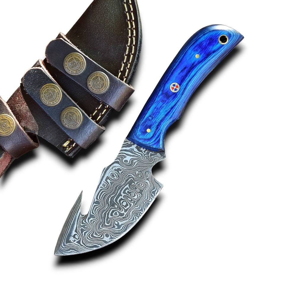 มีดสกินเนอร์เหล็กดามัสกัสแบบกำหนดเองขายส่ง ด้ามไม้ OEM ODM สำหรับล่าสัตว์ ตั้งแคมป์ เอาตัวรอด EDC พร้อมปลอกหนัง