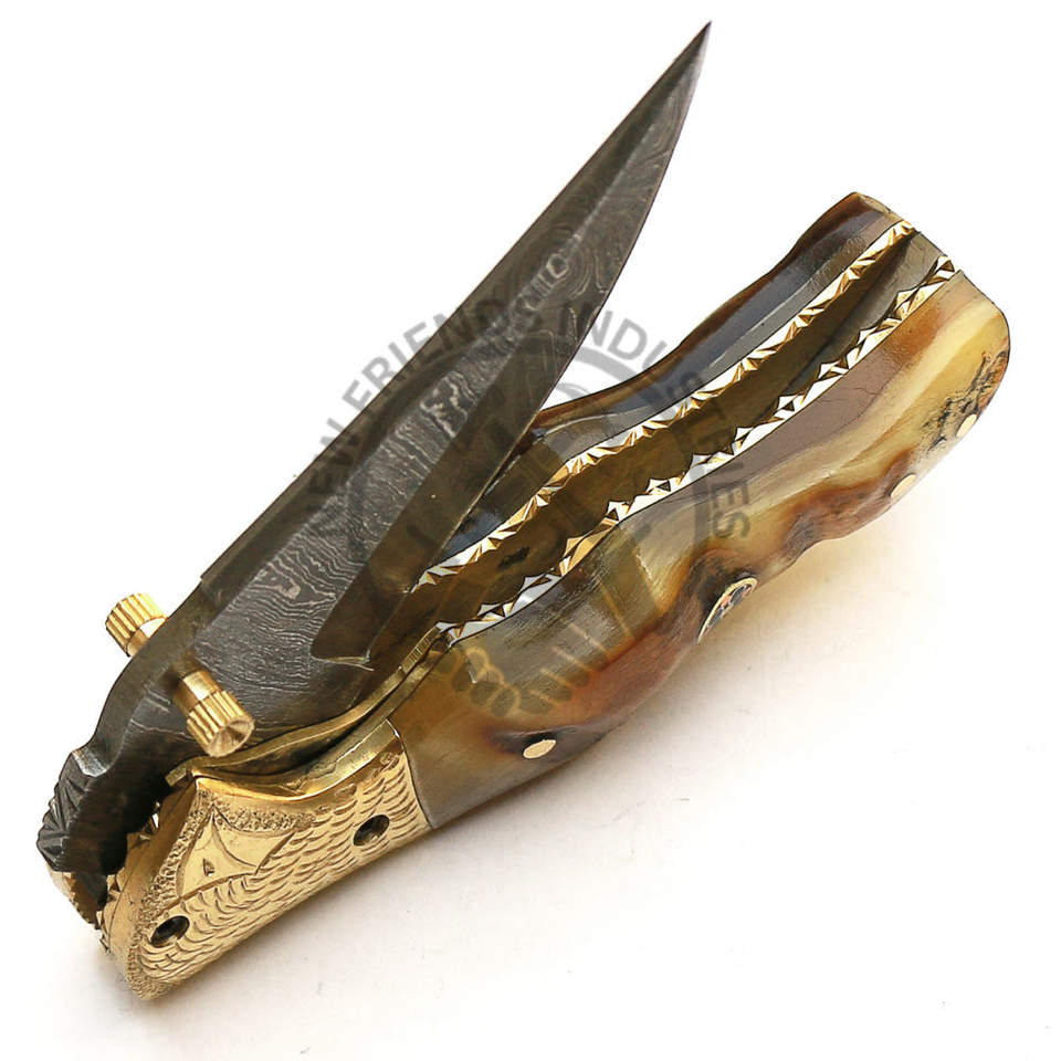 มีดพับเหล็กดามัสกัสแบบกำหนดเองมีดพับมือสลักด้วยมือด้ามจับฮอร์น