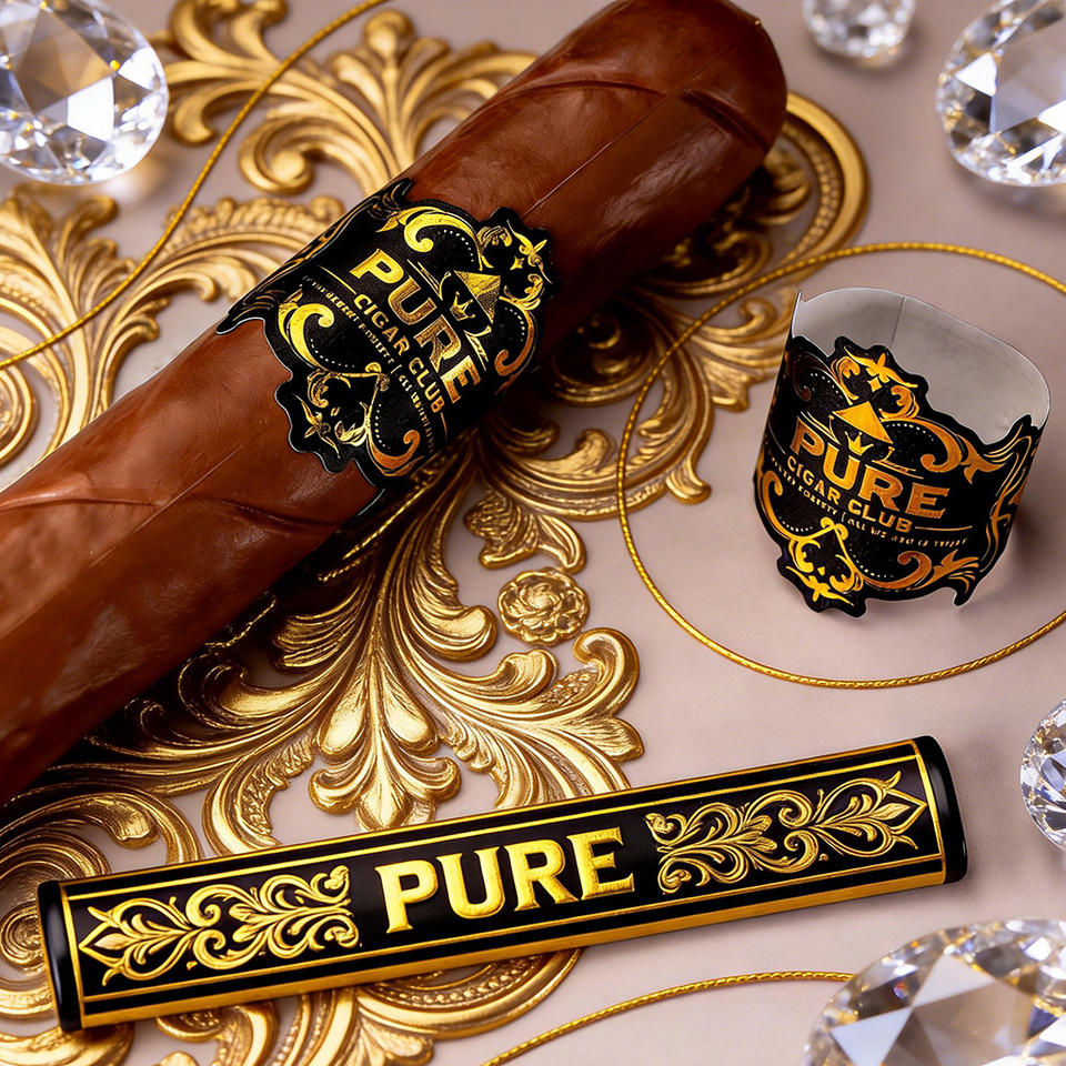 ป้ายวงแหวนซิการ์แบบกาวติดเอง ผลิตตามสั่ง ขายส่ง เป็นมิตรกับสิ่งแวดล้อม กันน้ำ ทำจากกระดาษอาร์ต พิมพ์โลโก้ปั๊มฟอยล์ทอง พร้อมตัดตามแบบ