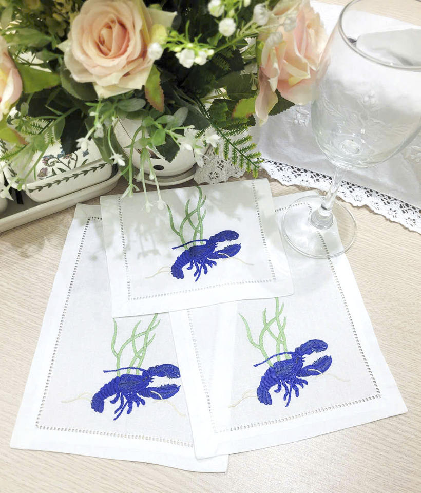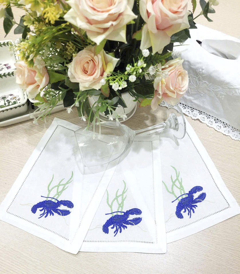 ผ้าเช็ดปากค็อกเทลปักลายกุ้งมังกรสีน้ำเงินแบบขายส่ง ผ้าฝ้ายสีขาวเย็บริมผ้าแบบพับได้ สำหรับงานเลี้ยงที่บ้าน บาร์ และงานอีเว้นท์ต่างๆ