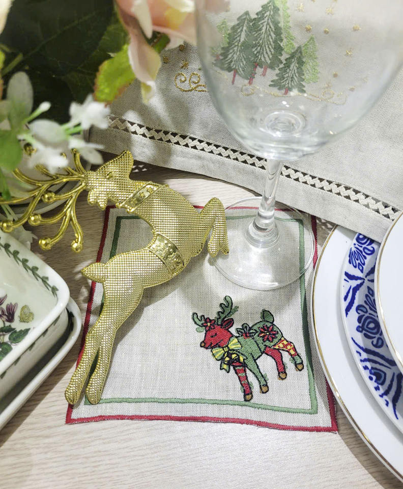 ที่รองแก้วขอบสีแดงสีเขียวผ้าลินินธรรมชาติลายกวางสำหรับบาร์ในบ้านงานปักลวดลายได้ตามต้องการ