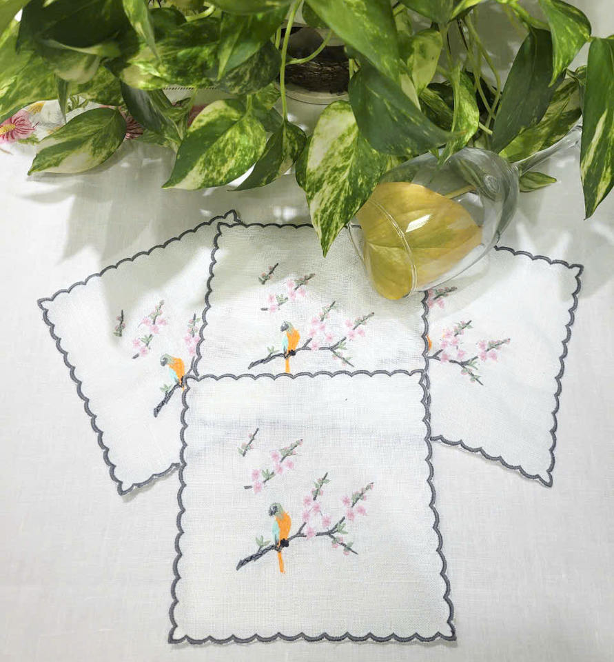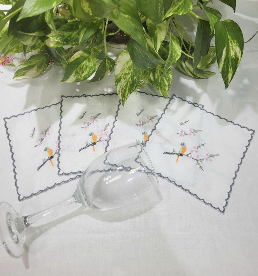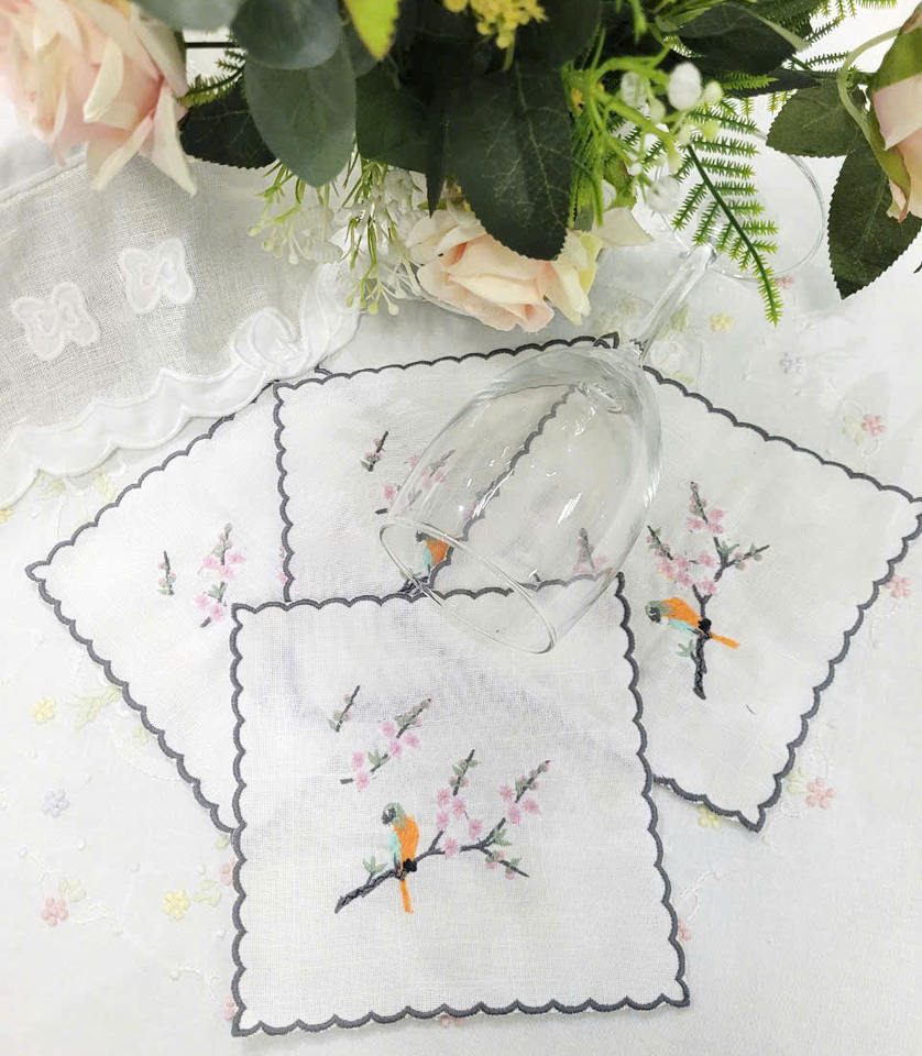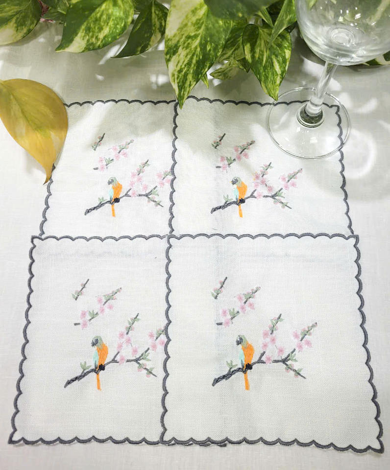 ผ้าเช็ดปากค็อกเทลขอบหยักลายปักลายนกและลูกพีชแบบสั่งทำขายส่ง ผ้าโพลีลินิน สำหรับงานเลี้ยงที่บ้านและบาร์