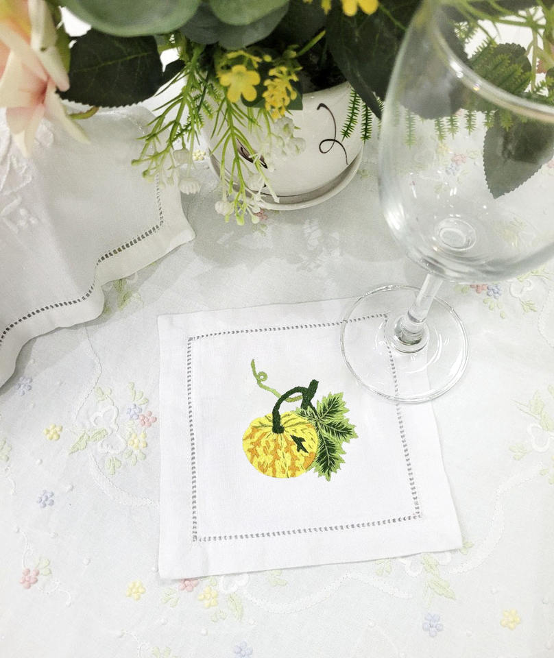 ผ้าเช็ดปากค็อกเทลปักลายฟักทองแบบกำหนดเองขายส่ง ผ้าฝ้ายสีขาวเย็บริมผ้า สำหรับงานเลี้ยงที่บ้าน บาร์