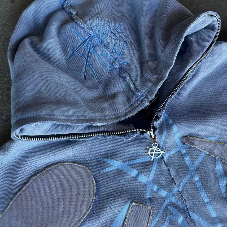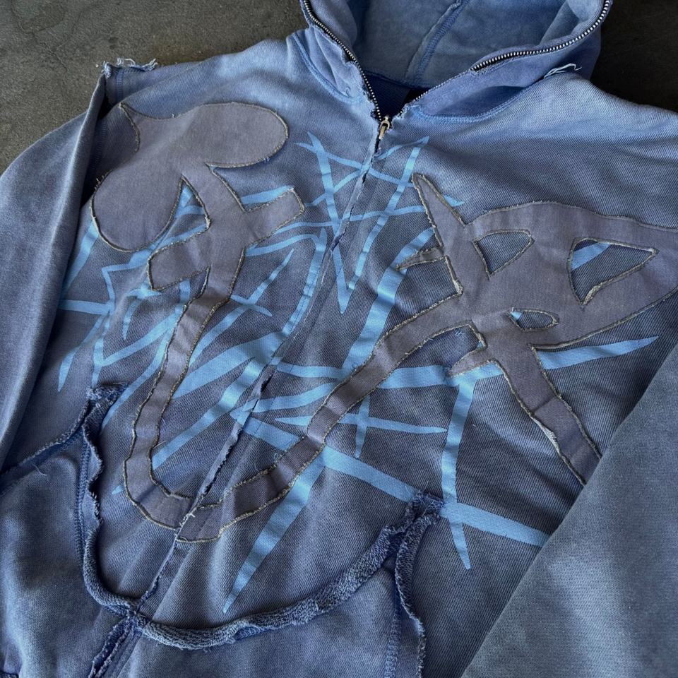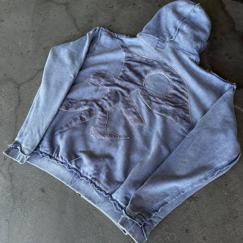 เสื้อฮู้ดดี้ปักลายพิมพ์ลายตามสั่งขายส่ง ผ้าฝ้าย แต่งผ้าปะติดสีเดียวกัน เสื้อฮู้ดดี้โอเวอร์ไซส์ ซิปหน้า ล้างสีแบบแอซิดวอช