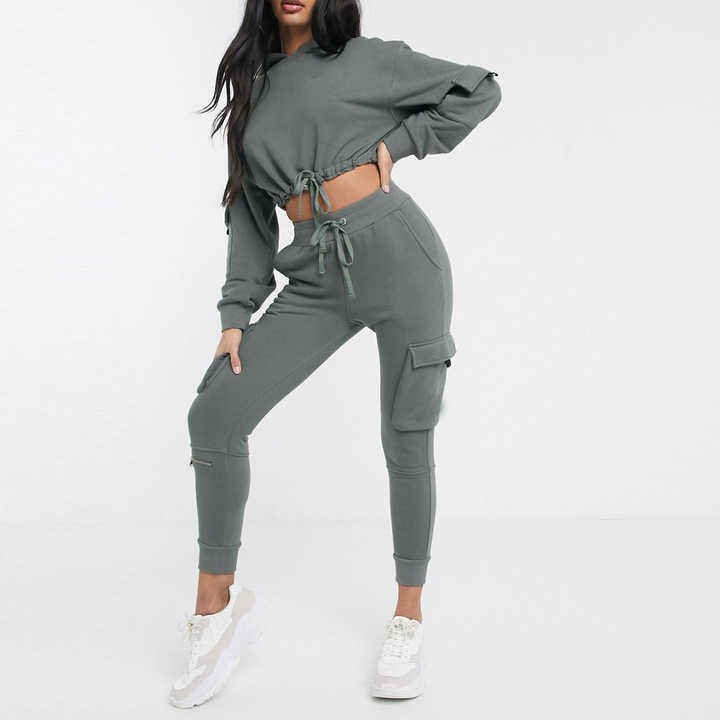 ชุดเซ็ตแทรคสูทลำลองแฟชั่นผู้หญิงแบบมีฮู้ด ผ้าฝ้าย 100% ซิปหน้า 2 ชิ้น สั่งทำขายส่ง จัดส่งทางอากาศ