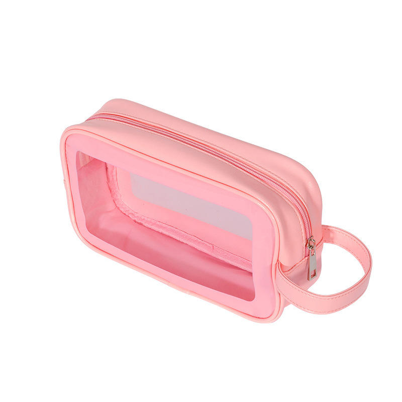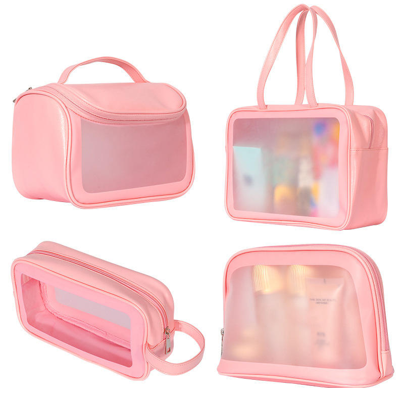 กระเป๋าเครื่องสำอางเดินทางมีซิปกึ่งใสทำจาก PU กระเป๋าแต่งหน้า PVC ใสมีตัวอักษรแฟชั่นออกแบบได้ตามต้องการ