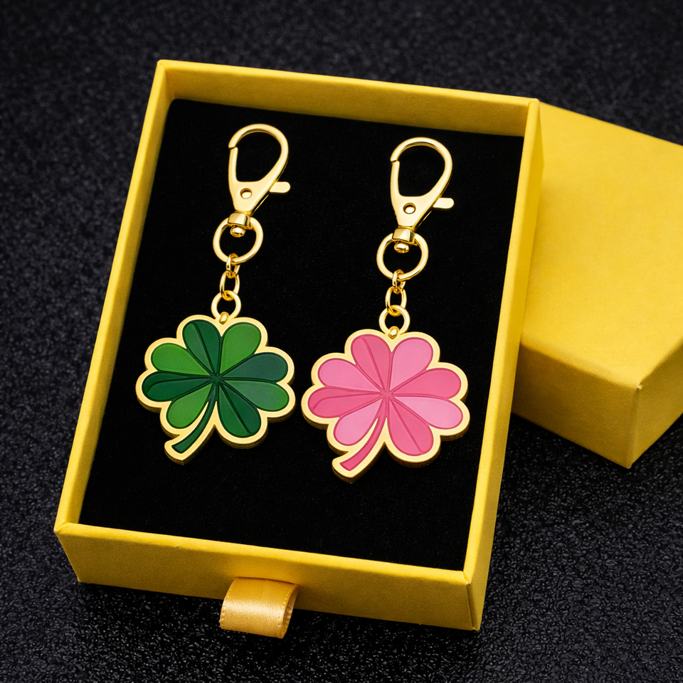 พวงกุญแจรูปใบโคลเวอร์สี่แฉกแบบขายส่ง แฟชั่นสีดำ สไตล์อนิเมะ สปริงสีชมพู สีเขียว สำหรับคลับ