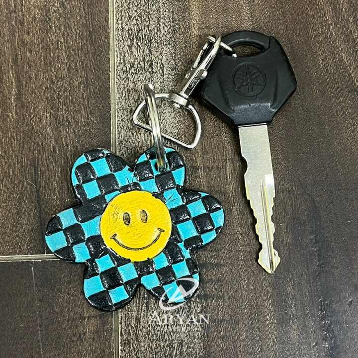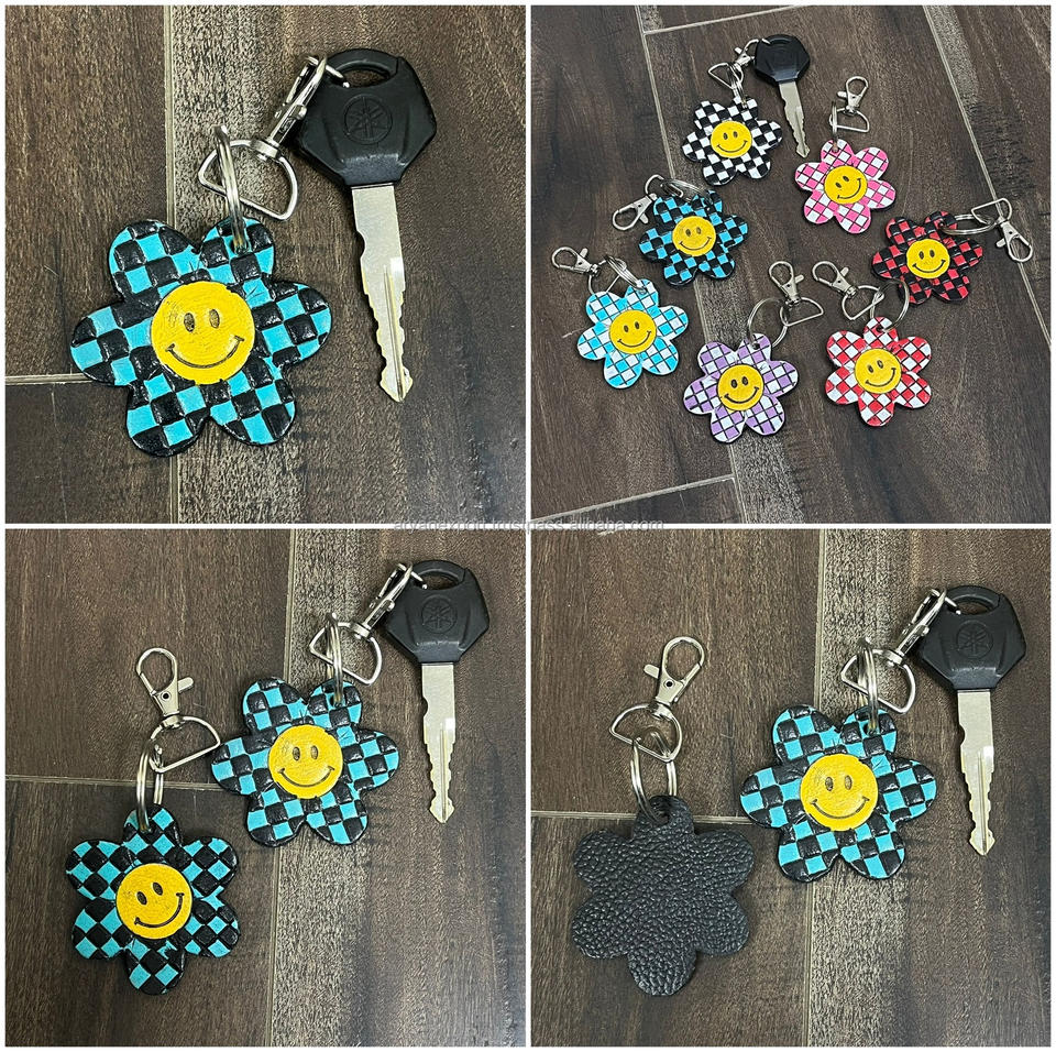 พวงกุญแจหนังแท้ลายดอกไม้แบบขายส่ง งานสั่งทำพิเศษ หนังลายตารางพรีเมียม ดีไซน์หน้ายิ้มน่ารัก ใช้ตกแต่งกระเป๋าได้ เหมาะสำหรับทุกเพศ