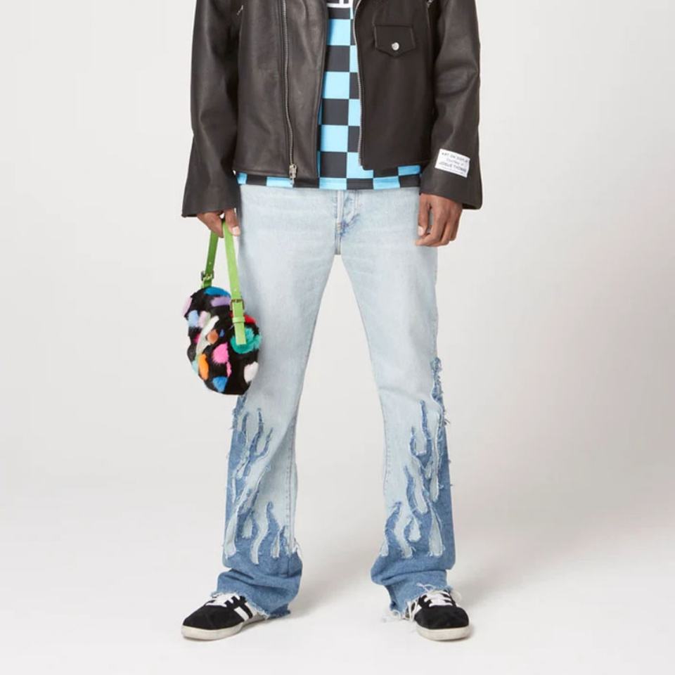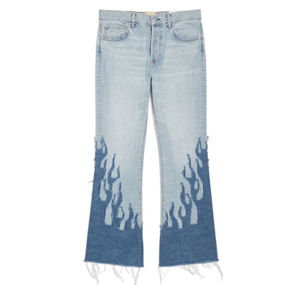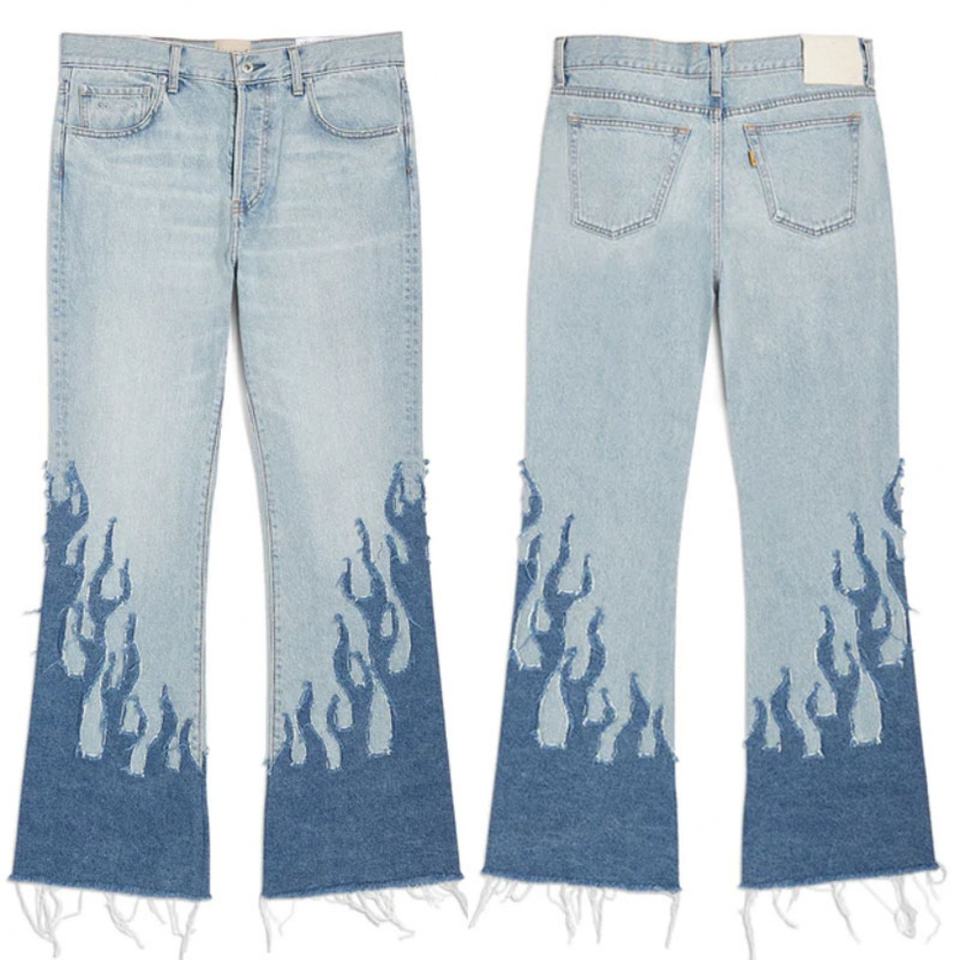 กางเกงยีนส์ทรงแฟลร์สีน้ำเงินวินเทจปักลายไฟ ดีไซน์เนอร์แฟชั่นคุณภาพดีสั่งทำขายส่งสำหรับผู้ชาย