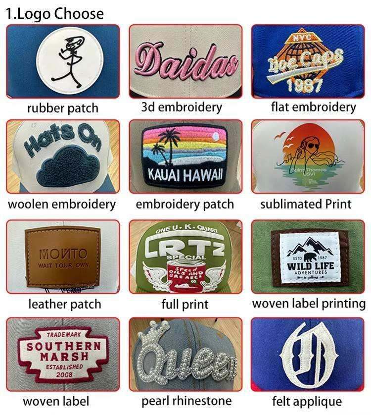 Logo position:brim/visor, front panel, Left panel, Right Panel, back curved part, Customized