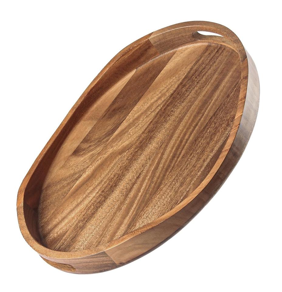 Wholesale Custom Handmade Decorative Rustic Brown Round Walnut Wood Serving Food Tray with Handle Dishwasher & Microwave Safe