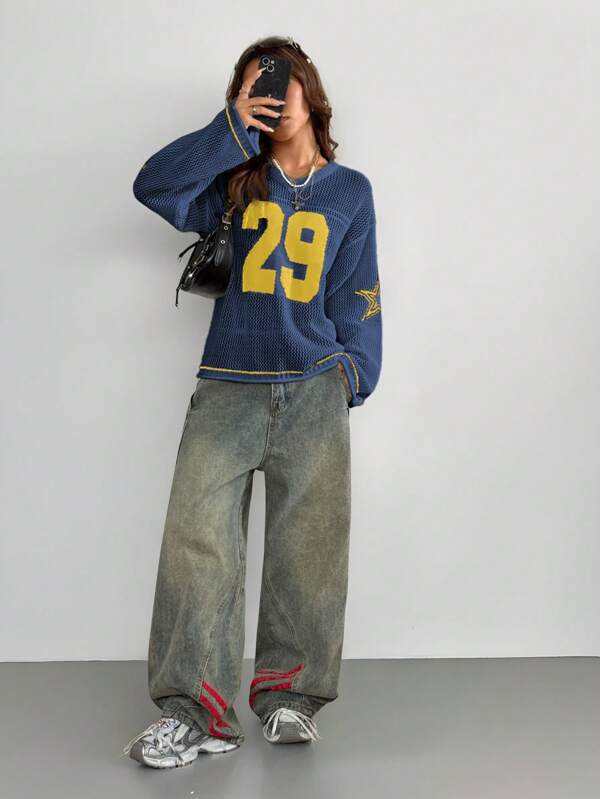 เสื้อเจอร์ซีย์ถักตาข่ายแบบสั่งทำขายส่งสำหรับผู้หญิง ทรงโอเวอร์ไซส์ แขนยาว พิมพ์ลายตัวเลข สไตล์สตรีทแวร์ ผู้ผลิต OEM ODM
