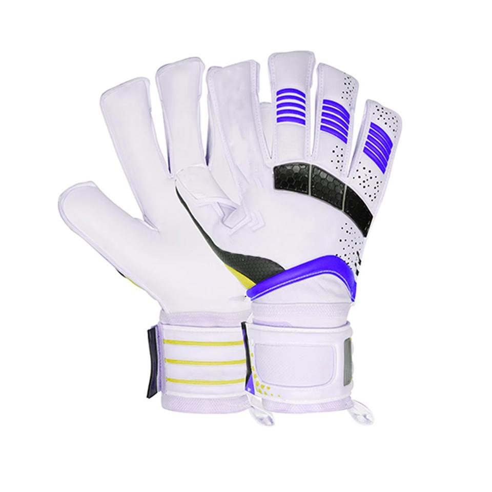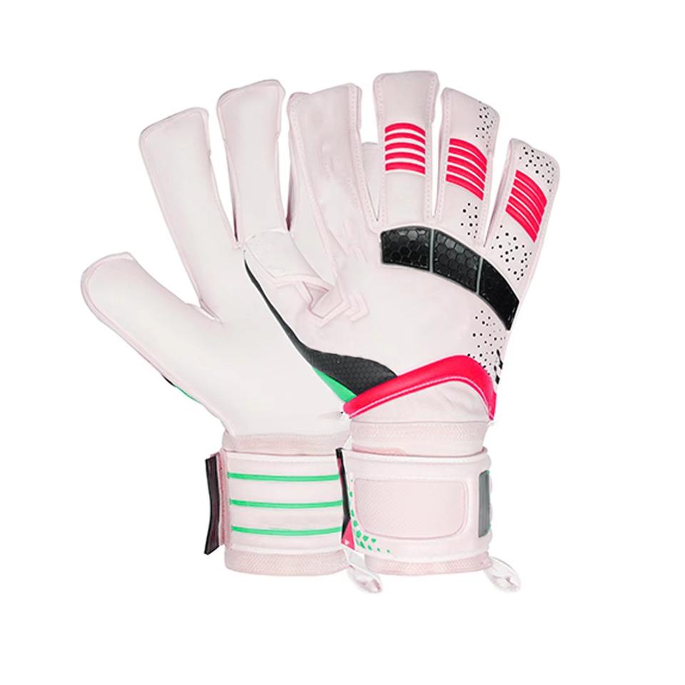 ถุงมือผู้รักษาประตูฟุตบอลมืออาชีพสำหรับเล่นกลางแจ้ง ระบายอากาศได้ดี กันลื่นที่ปลายนิ้ว ปิดด้วยแถบตีนตุ๊กแก ทำจากหนังและยางลาเท็กซ์ รับผลิตตามสั่งขายส่ง