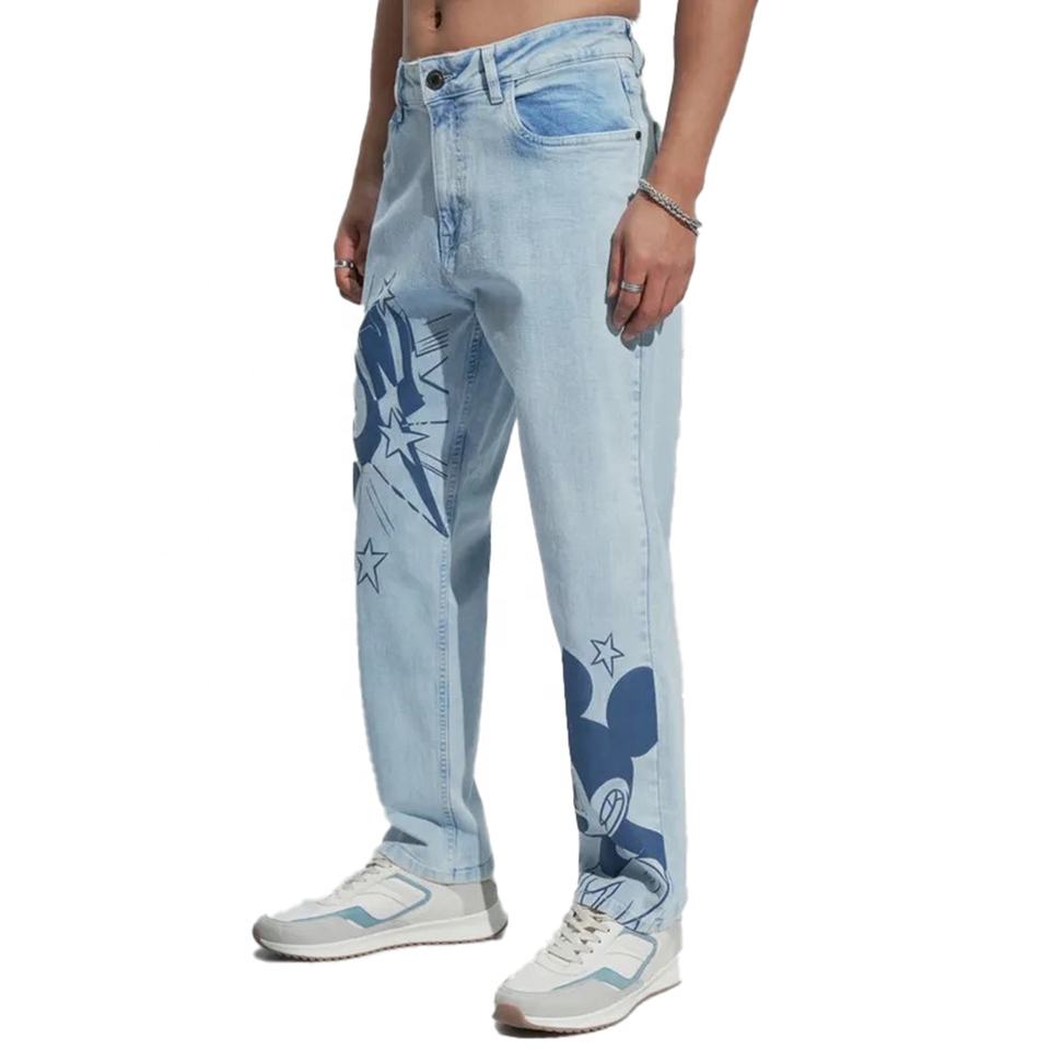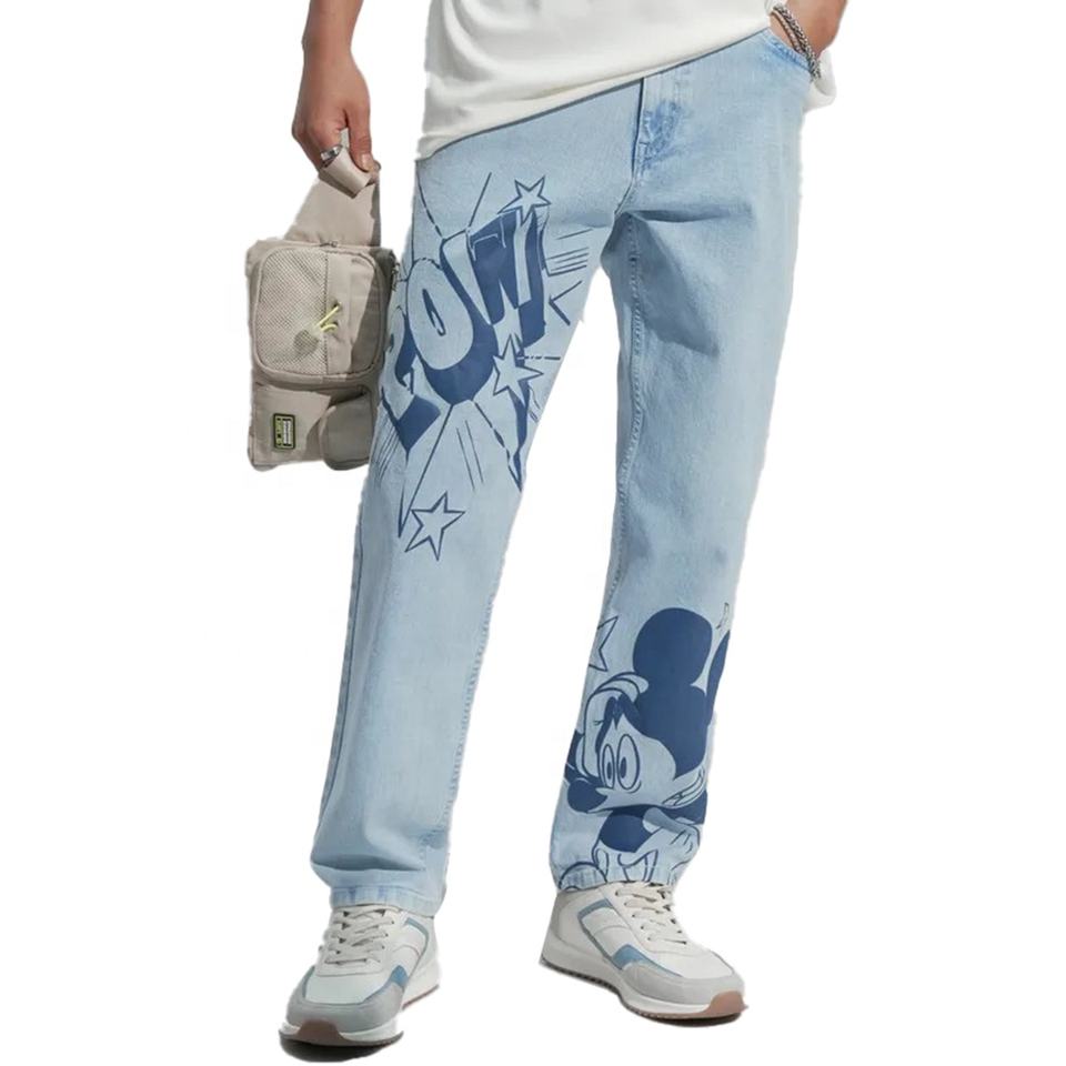 กางเกงยีนส์ขาบานสีฟ้าอ่อนสำหรับผู้ชายกางเกงขากว้างสไตล์สตรีทแฟชั่นมีเอกลักษณ์สีหมึกสาดน้ำหนักเบา