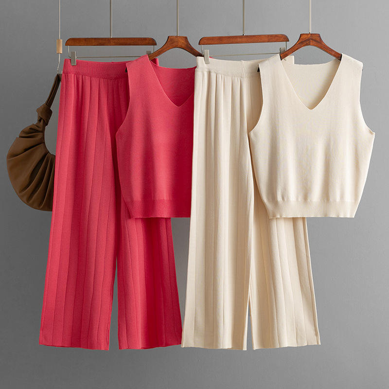 ชุดเซ็ตสองชิ้นถักนิตติ้งคอวีแบบลำลองสำหรับผู้หญิง พร้อมโลโก้สั่งทำขายส่ง เสื้อกล้ามแขนกุดทรงหลวม กางเกงขายาวทรงกว้าง