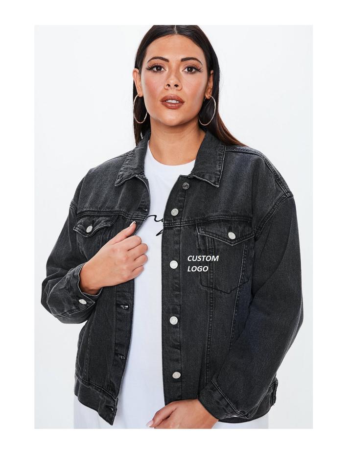 แจ็กเก็ตผ้ายีนส์ผ้าฝ้ายทอลายทแยงสีฟ้าขนาดใหญ่ทรงหลวมสำหรับผู้หญิงแจ็กเก็ตกลางแจ้งสไตล์วินเทจขนาดใหญ่ออกแบบโลโก้ได้ตามต้องการ
