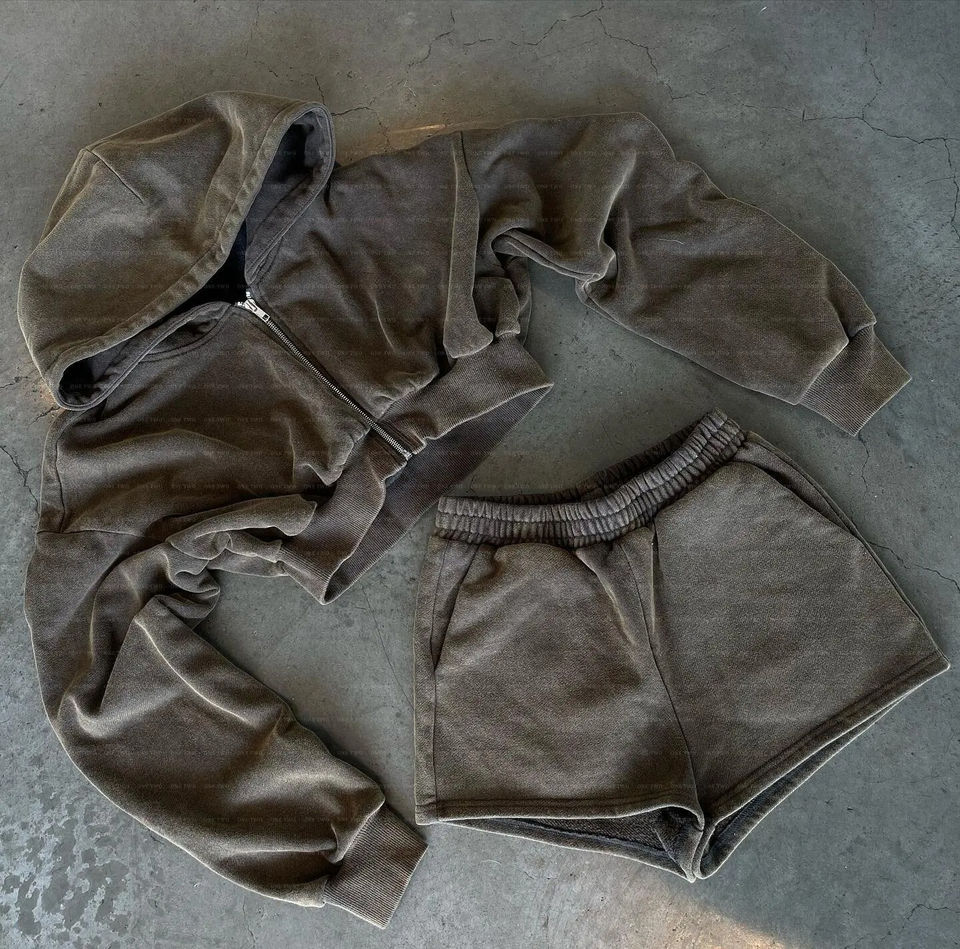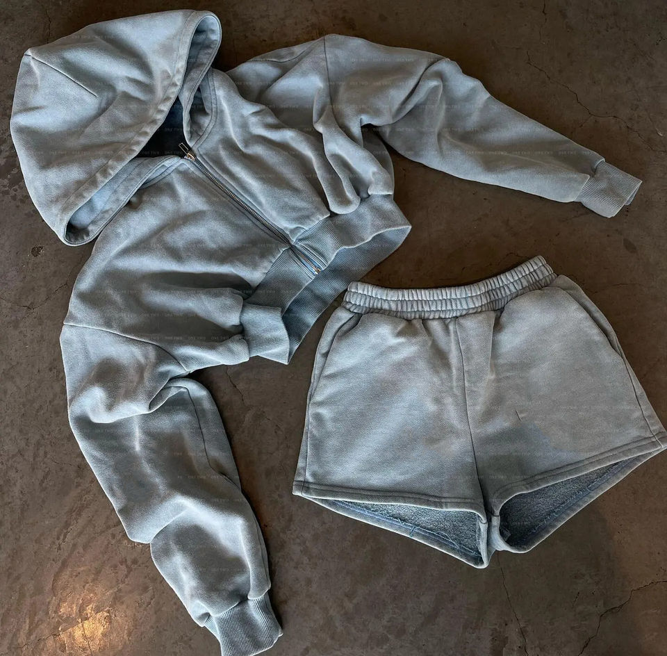 ชุดเซ็ตสองชิ้นแบบครอปพิมพ์โลโก้ตามสั่งขายส่ง เสื้อฮู้ดดี้และกางเกงขาสั้นสำหรับผู้หญิง สไตล์ Y2k ล้างสีแบบแอซิด ชุดเซ็ตสองชิ้นขาสั้นสำหรับออกกำลังกายสำหรับผู้หญิง