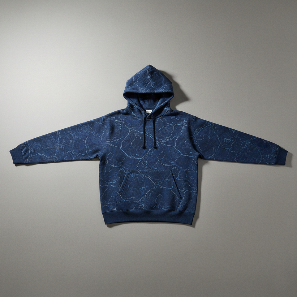 เสื้อฮู้ดดี้พิมพ์ลายภูมิประเทศสีน้ำเงินแบบดิจิทัล สั่งทำโลโก้ได้ ผลิตจำนวนมาก ผ้าฝ้ายฟลีซ 100% ระบายอากาศได้ดี สไตล์สตรีทแวร์สำหรับผู้ชาย มีกระเป๋าเสื้อ