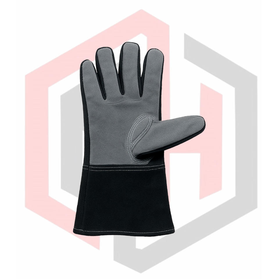 ถุงมือเชื่อมโลหะแบบยาว ทนความร้อน สีพื้น ผลิตตามสั่ง พร้อมโลโก้ คุณสมบัติความปลอดภัย หนัง 7 ออนซ์ 14 นิ้ว ผ้าถักลายเม็ด
