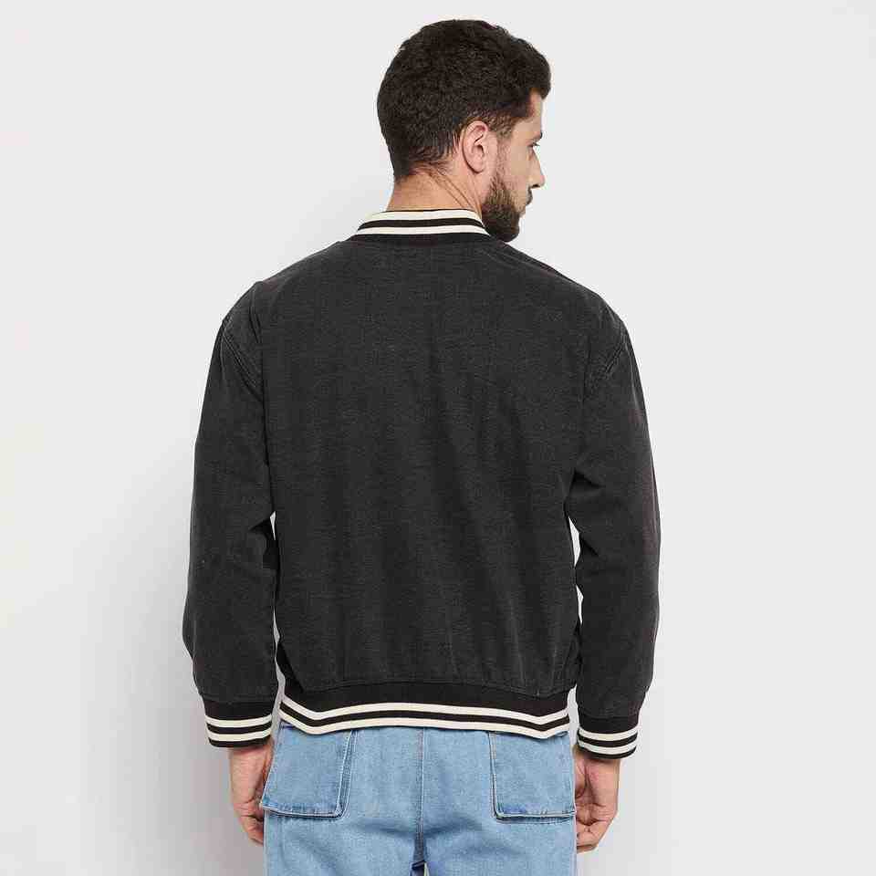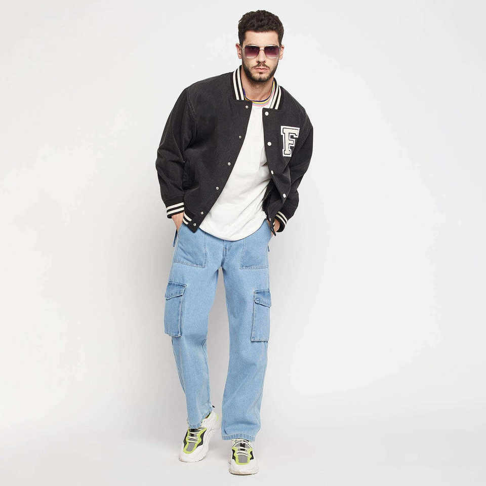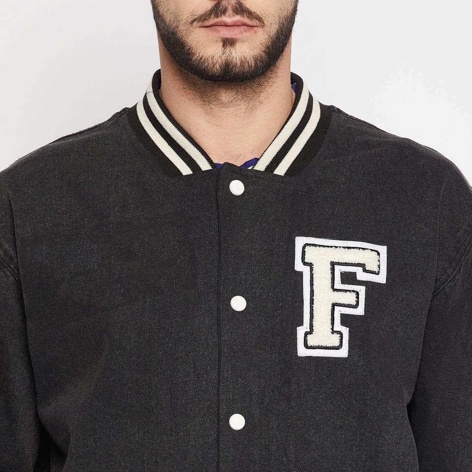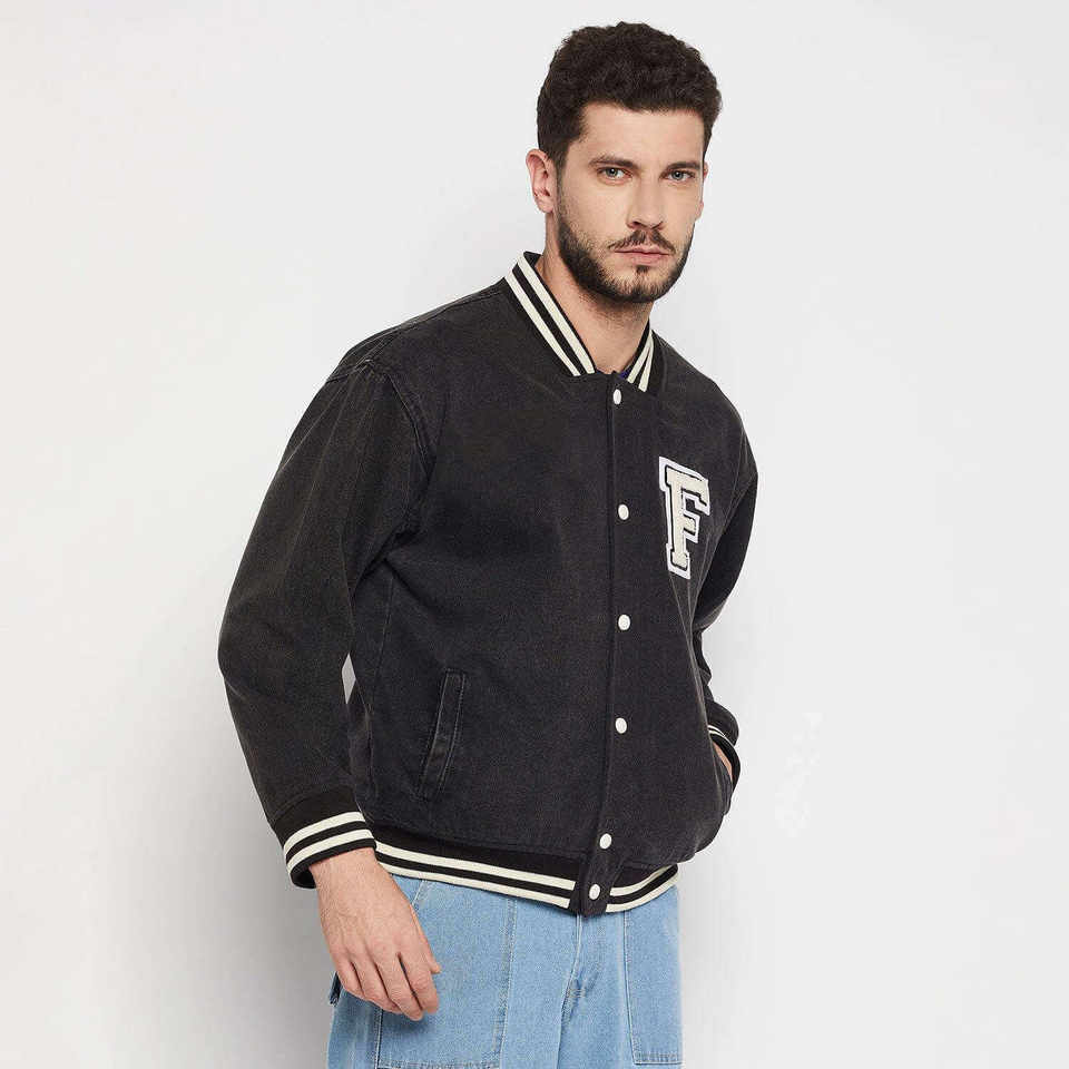 แจ็คเก็ตยีนส์วาร์ซิตี้แบบขายส่งพร้อมโลโก้สั่งทำสำหรับผู้ชาย ปิดด้วยกระดุม มีกระเป๋า เหมาะสำหรับฤดูหนาว แจ็คเก็ตเบสบอลบอมเบอร์สำหรับผู้ชายสำหรับกิจกรรมกลางแจ้ง
