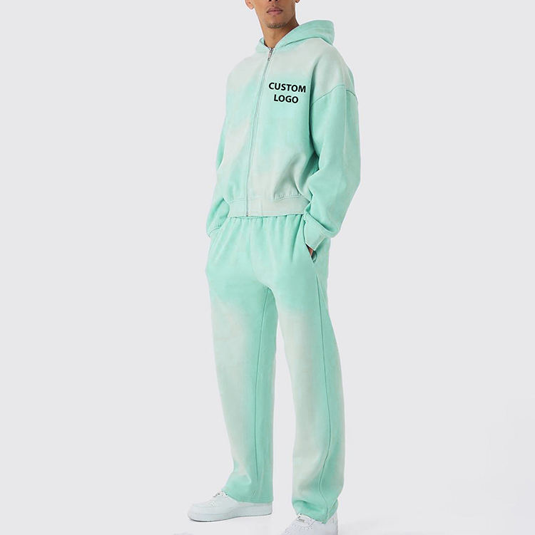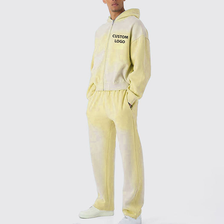 ชุดเซ็ตเสื้อฮู้ดครอปซิปแบบสปอร์ตทรงบ็อกซี่ผ้าฝ้ายสำหรับผู้ชายพร้อมกางเกงขายาวทรงบาน สกรีนโลโก้ตามสั่งขายส่ง