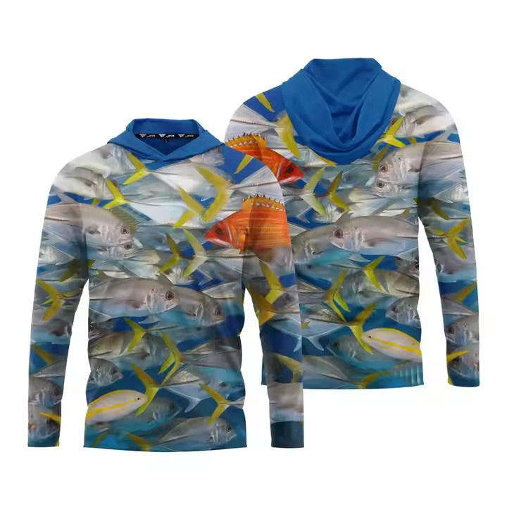 ชุดเสื้อตกปลาแขนยาวมีฮู้ดสำหรับ Upf50ชุดพิมพ์ลายโลโก้ได้ตามต้องการ