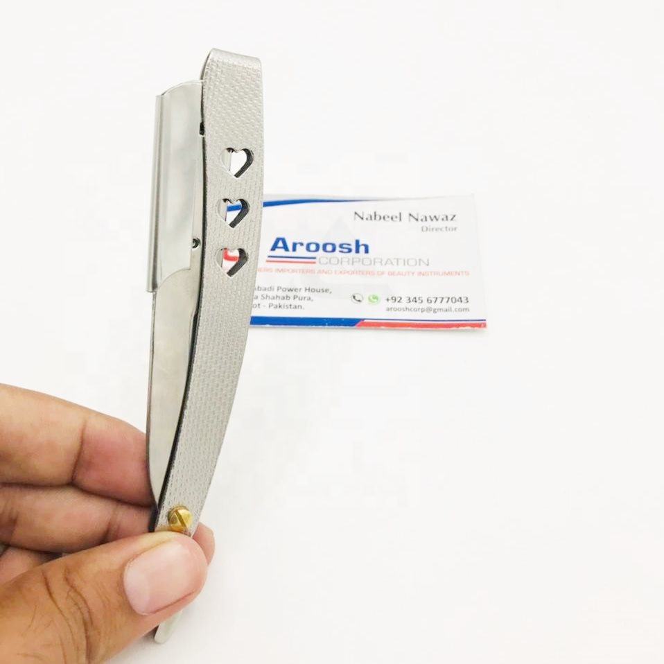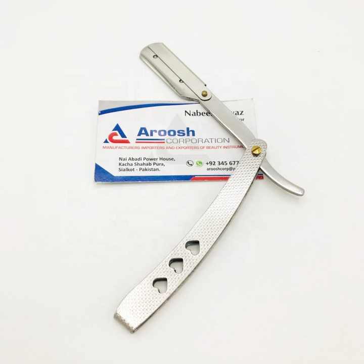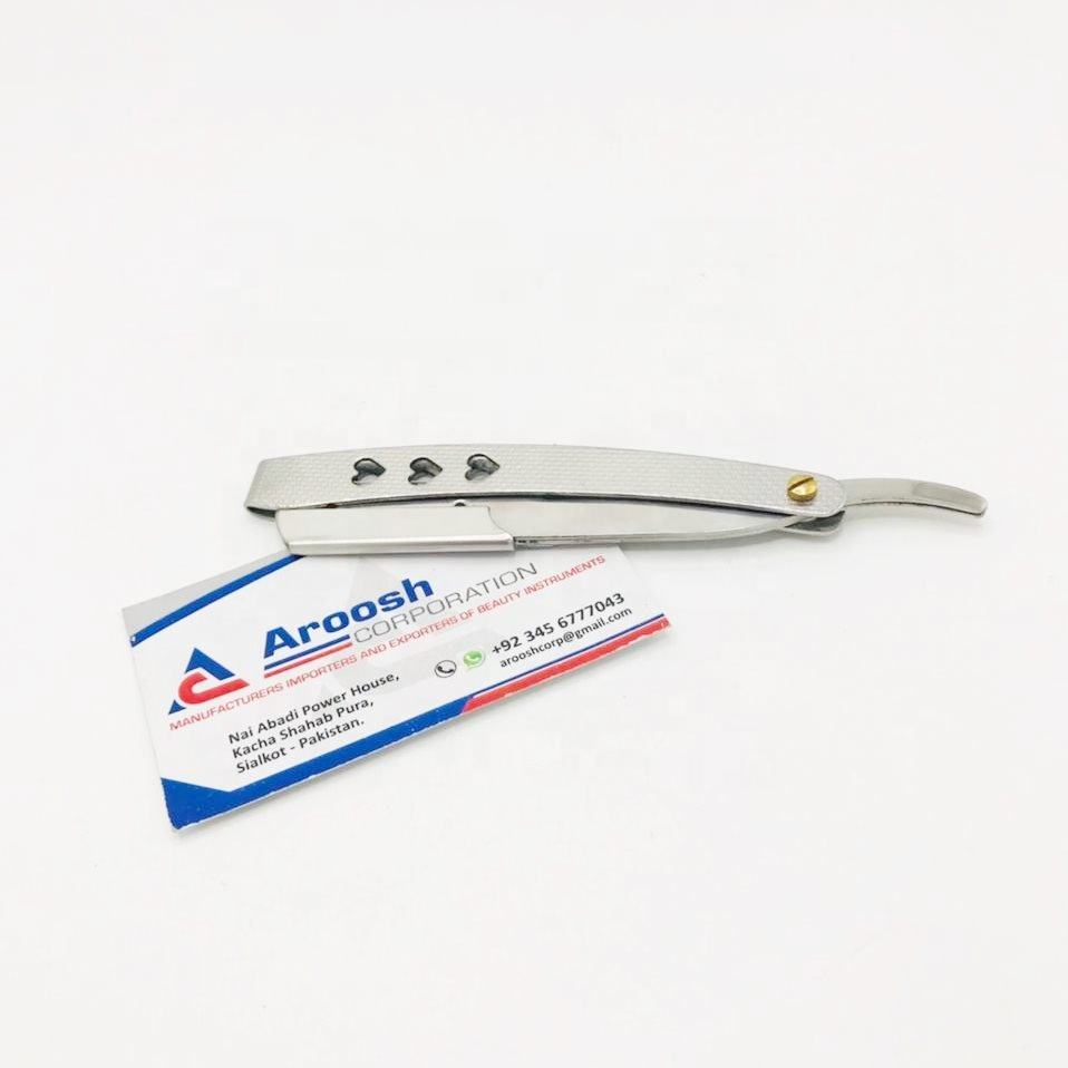 มีดโกนหนวดแบบพับได้ด้ามจับเหล็กอย่างยั่งยืนโลโก้ออกแบบได้ตามต้องการสำหรับใช้ในร้านตัดผมมืออาชีพ