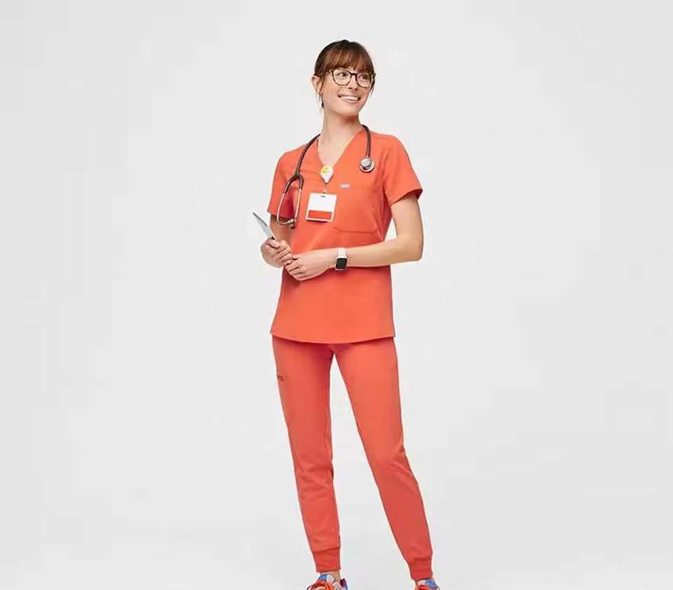 ชุดสครับพยาบาลแบบยืดได้พร้อมปักโลโก้ตามสั่งขายส่ง เสื้อสครับสำหรับพยาบาล ชุดยูนิฟอร์มทางการแพทย์สำหรับผู้หญิง