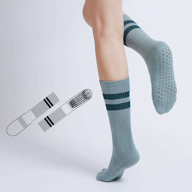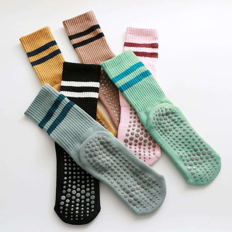 ถุงเท้าโยคะพิลาทิสกันลื่นแบบสปอร์ตผ้าฝ้ายสำหรับผู้หญิง แบรนด์พื้นฐานลายทางโลโก้สั่งทำขายส่ง