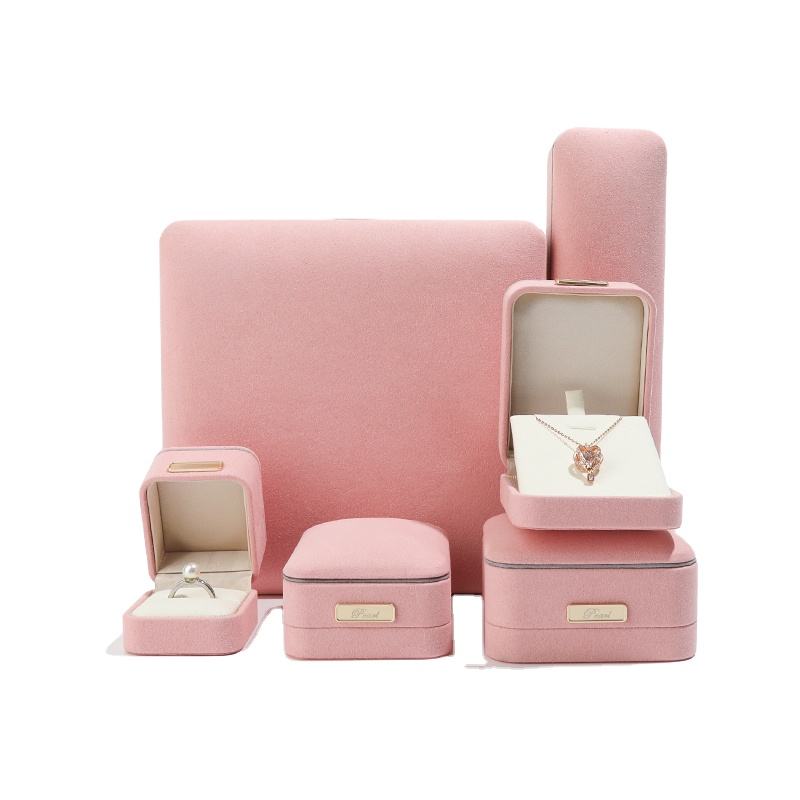 ขายส่งโลโก้ที่กำหนดเองกำมะหยี่สีชมพูหรูหราสร้อยข้อมือกำไลไมโครไฟเบอร์ของขวัญสร้อยคอต่างหูแหวนกล่องอัญมณี