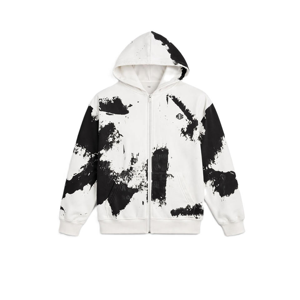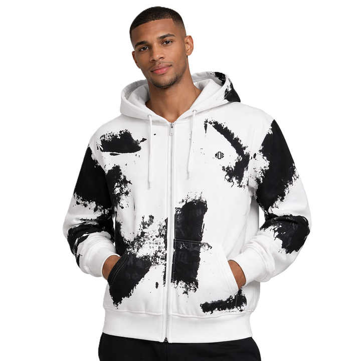เสื้อฮู้ดซิปพิมพ์ลายเพ้นท์สแปลตเตอร์สำหรับผู้ชาย สตรีทแวร์ผ้าฟลีซหนา รับผลิตตามสั่งพร้อมโลโก้ ขายส่งจำนวนมากจากโรงงาน