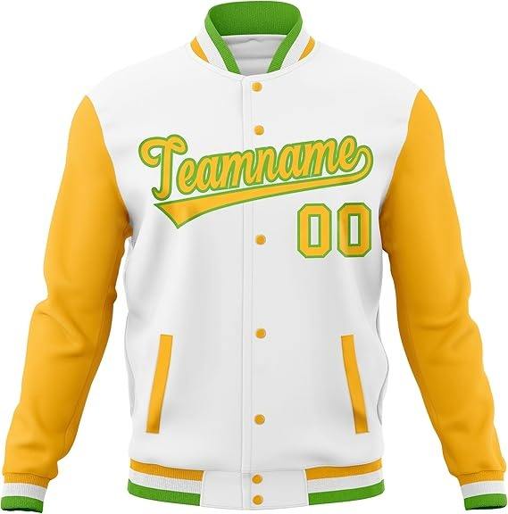 แจ็กเก็ตเบสบอลของผู้ชายแขนยาวสีเหลืองสีขาวปักโลโก้ได้ตามต้องการ
